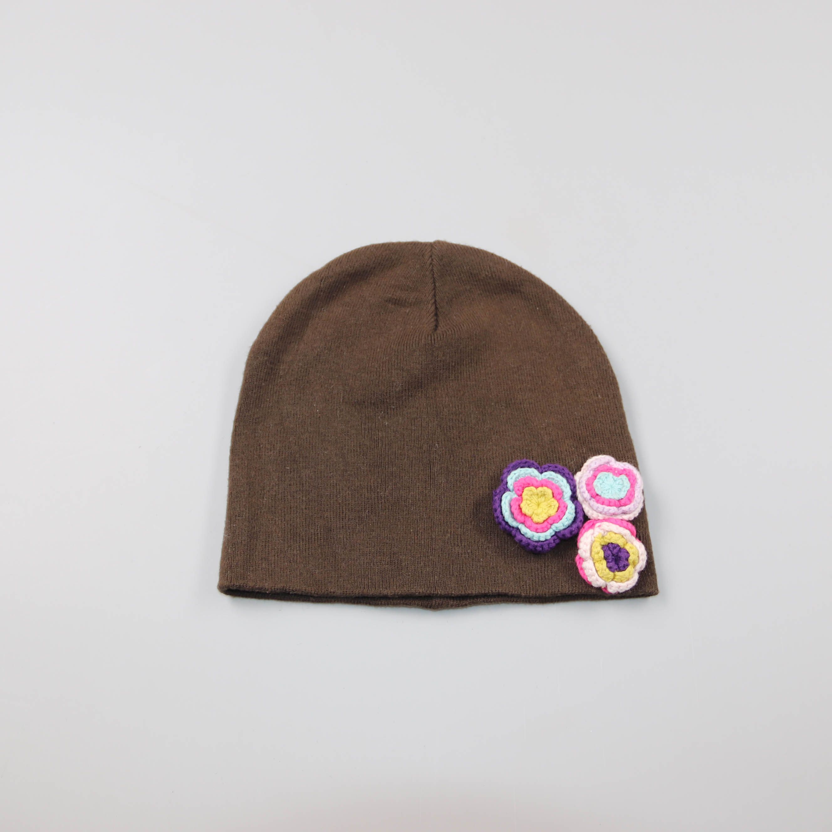 Коричневая трикотажная шапка-бини с декоративными вязанными цветками сбоку. Подойдёт для прохладной погоды в межсезонье и на каждый день. Лёгкая и компактная — удобно носить в сумке и быстро надевать при ветре.