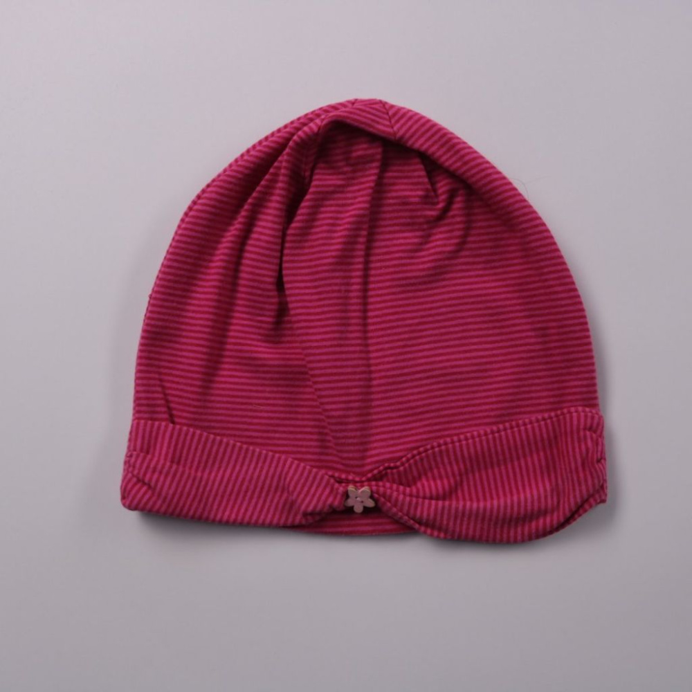 Шапка PUSBLU в розовую полоску с декоративным бантиком спереди. Подойдёт на прохладную погоду весной и осенью и хорошо сочетается с повседневными образами. Ткань с добавлением эластана тянется и комфортно сидит по голове.