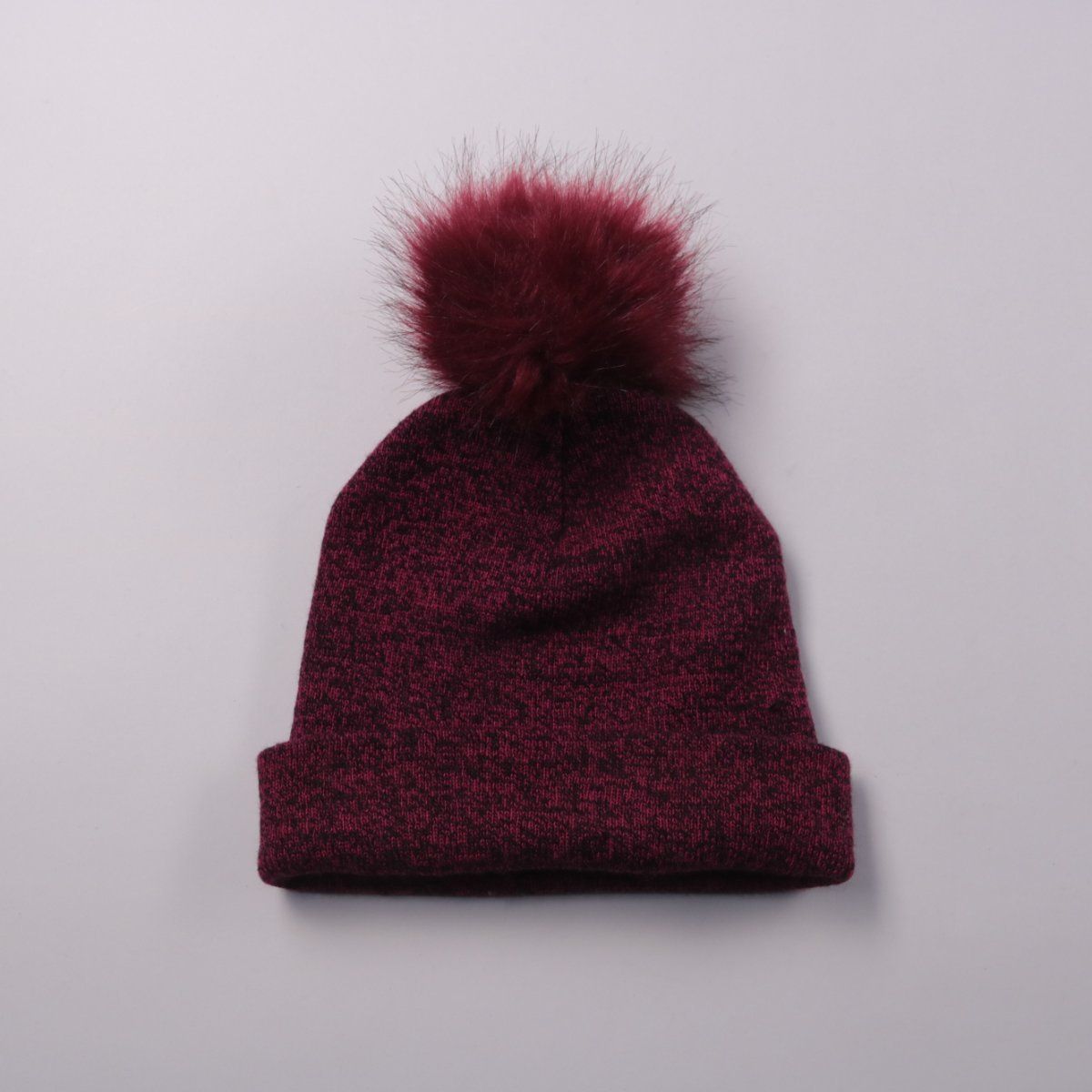 Вязаная шапка с помпоном, без указанного бренда, в бордовом меланжевом цвете. Подойдёт для зимних прогулок и повседневной носки, хорошо закрывает уши за счёт отворота. Практичный вариант: легко сочетать с тёмной верхней одеждой и шарфом.