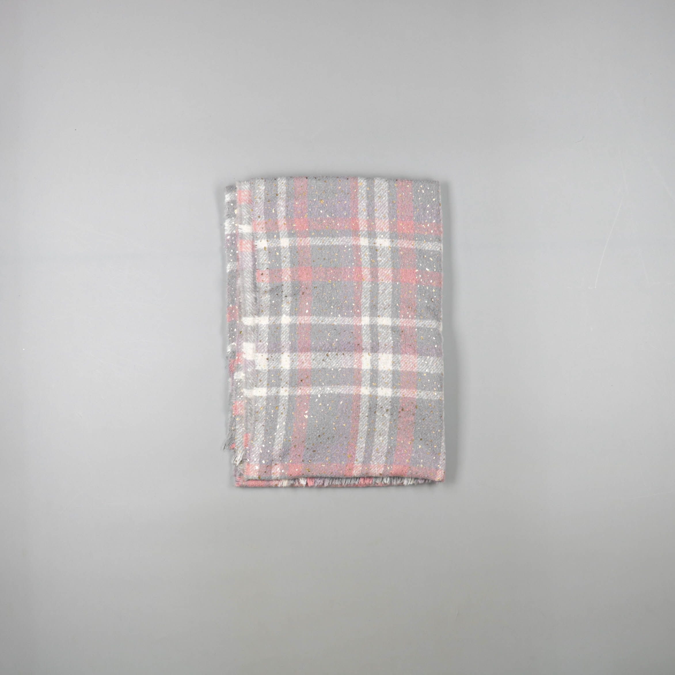 Шарф в серо-розовую клетку с лёгким мерцанием и бахромой по краям. Подойдёт для осени и весны, чтобы добавить акцент к пальто или куртке. Большой размер позволяет носить как палантин и удобно драпировать.