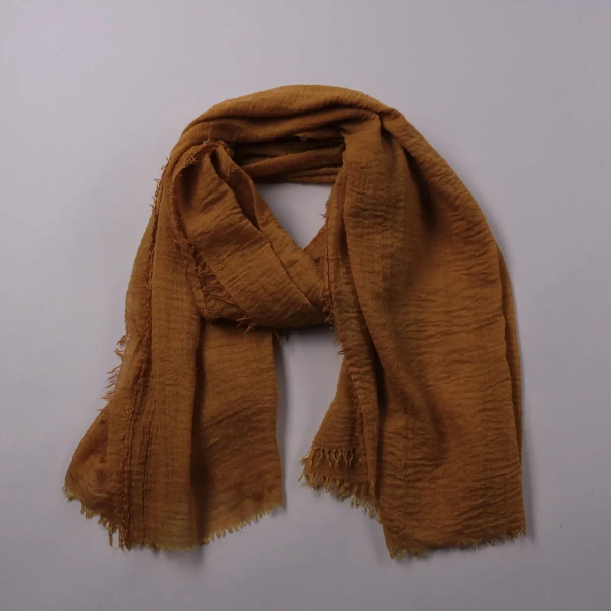 Шарф без бренда в горчично-коричневом цвете, с фактурной тканью и бахромой по краям. Подойдёт для повседневных образов в прохладную погоду и как лёгкий аксессуар на межсезонье. Удобно драпируется и добавляет тепла без лишнего объёма.