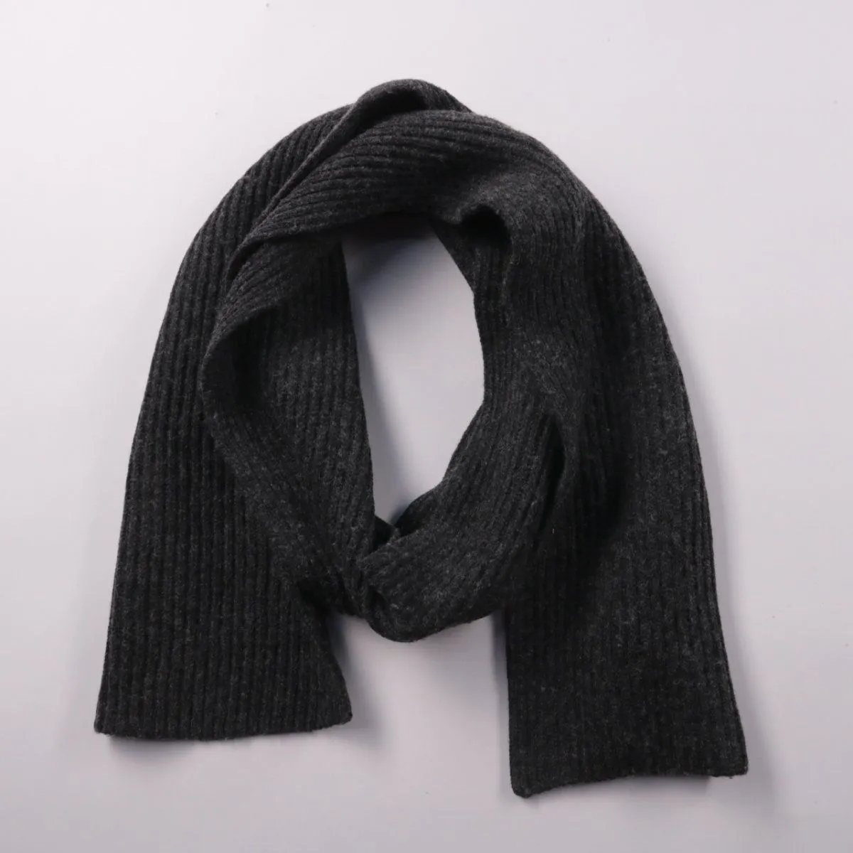 Вязаный ребристый шарф тёмного цвета без принтов. Подойдёт для зимних прогулок и повседневных образов, хорошо сочетается с пальто и пуховиками. Плотная вязка помогает сохранять тепло и удобно драпируется.