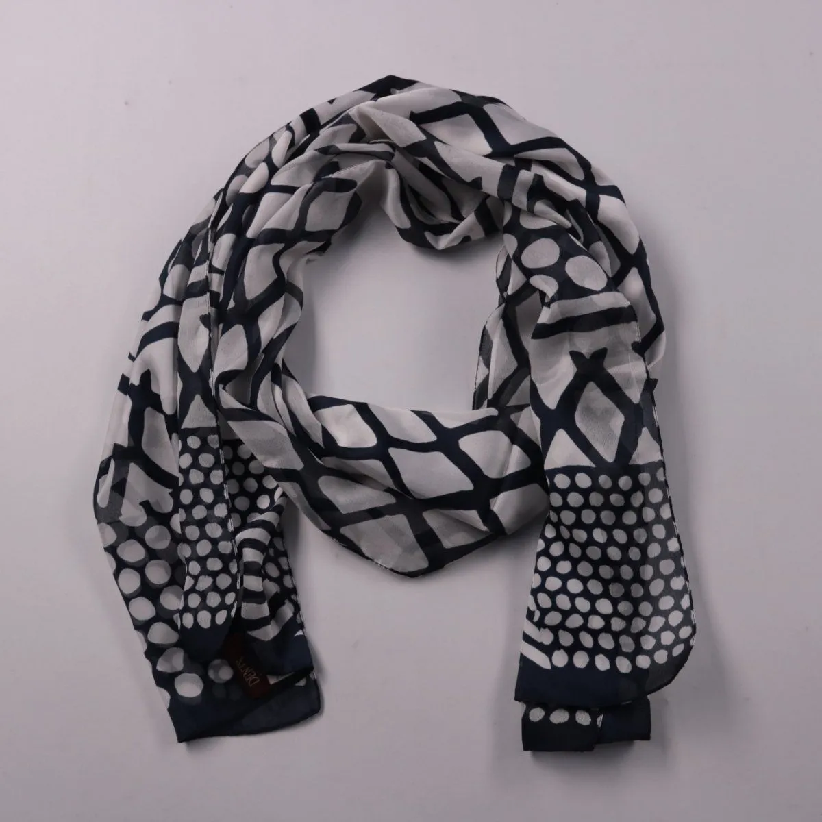 Шарф Dents с геометрическим принтом в сине-бело-серой гамме. Подойдёт для повседневных образов и как акцент к однотонной верхней одежде. Лёгкий материал удобно драпируется и быстро сохнет.