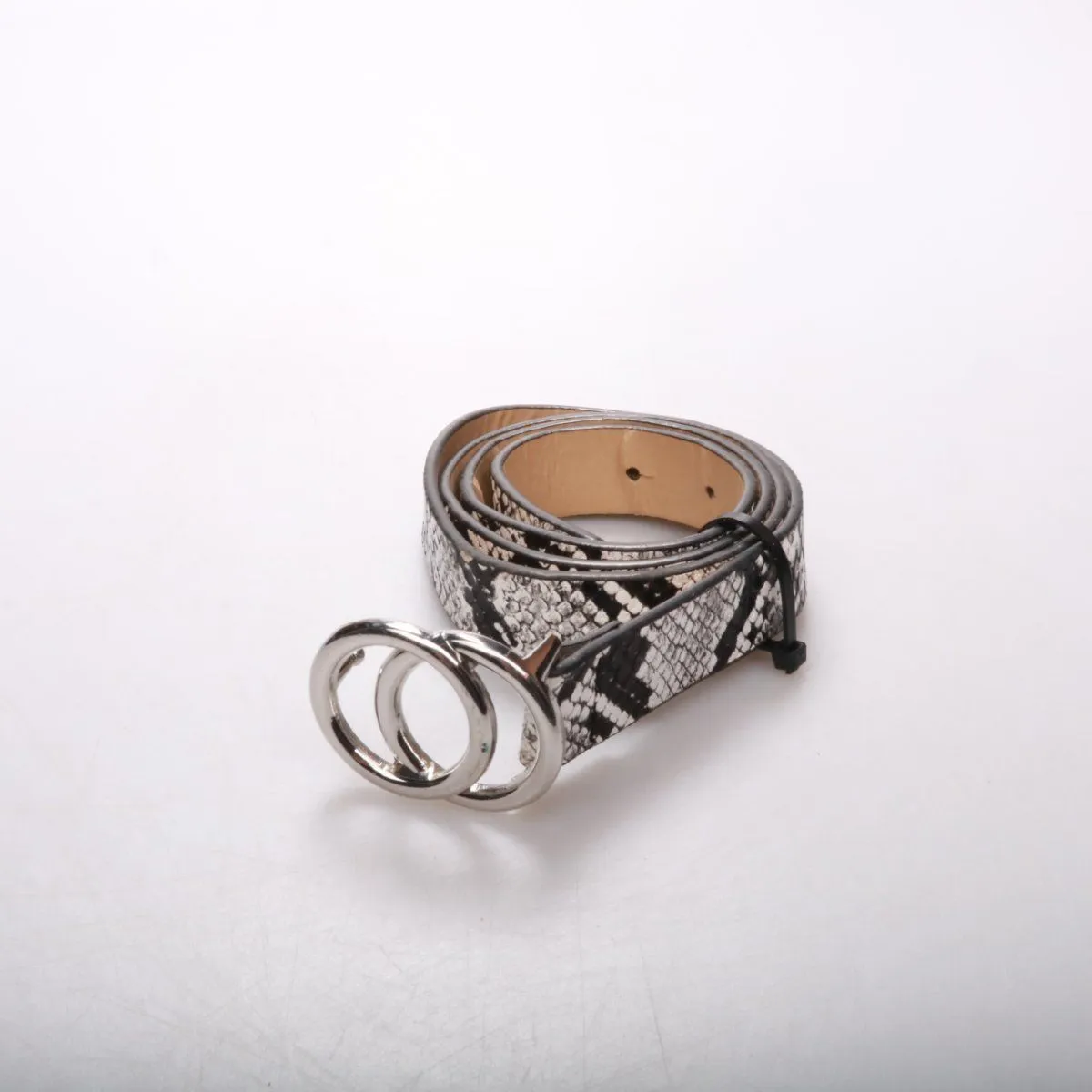 Ремень с принтом под змею и двойной круглой серебристой пряжкой. Подойдёт для джинсов, брюк или платьев, чтобы добавить акцент в образ. Прочная фурнитура и удобная регулировка по отверстиям.
