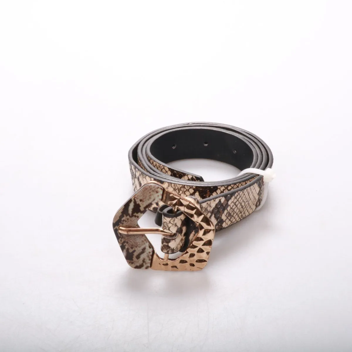 Женский ремень с принтом под змеиную кожу и фигурной золотистой пряжкой. Подойдёт к джинсам, брюкам или платью, чтобы подчеркнуть талию и добавить акцент в образ. Практичен тем, что регулируется по отверстиям и легко сочетается с базовыми цветами.
