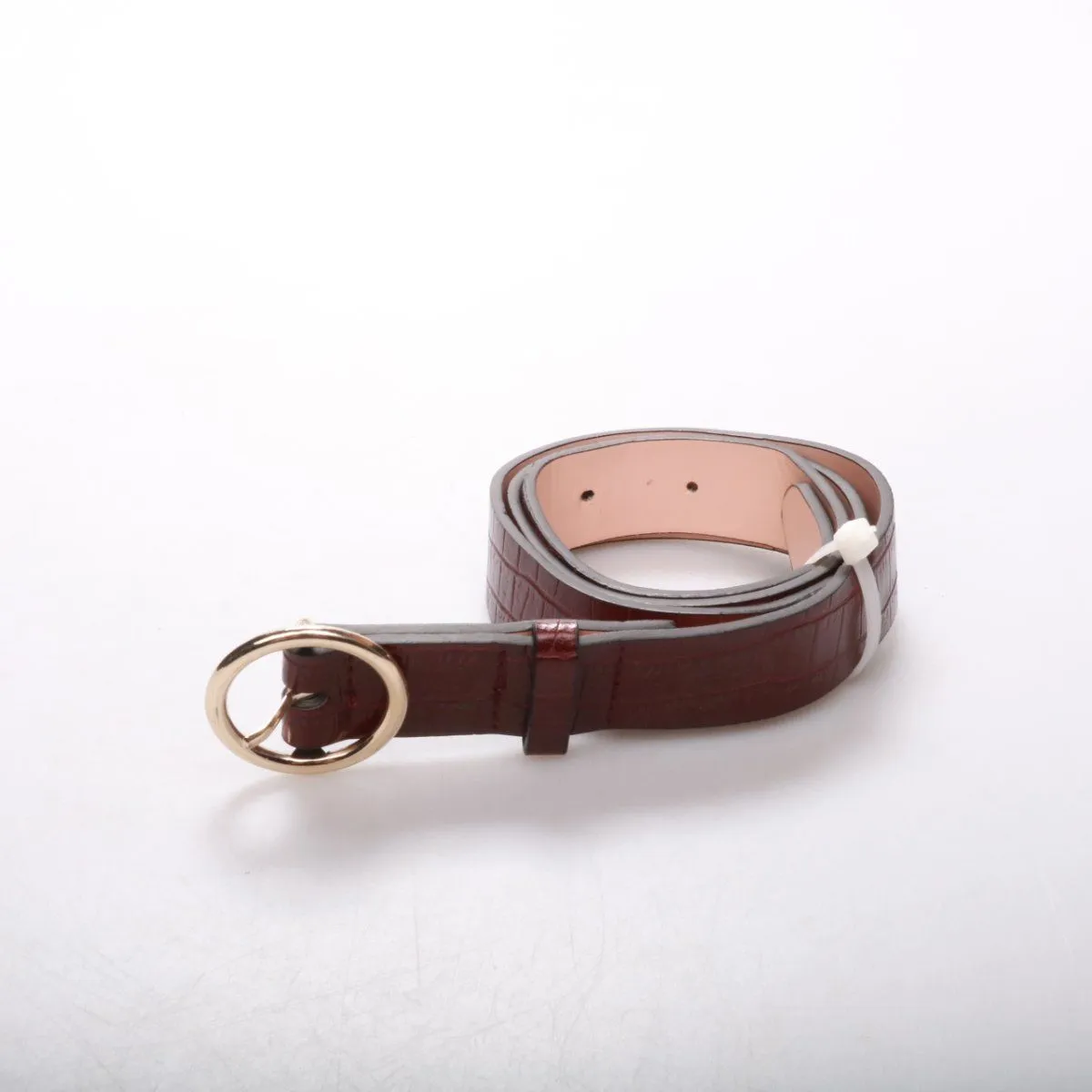 Ремень с тиснением под крокодила в бордовом цвете с овальной металлической пряжкой. Подойдёт к джинсам, брюкам или платью и добавит образу аккуратный акцент. Практичен тем, что легко регулируется по посадке и хорошо держит форму.