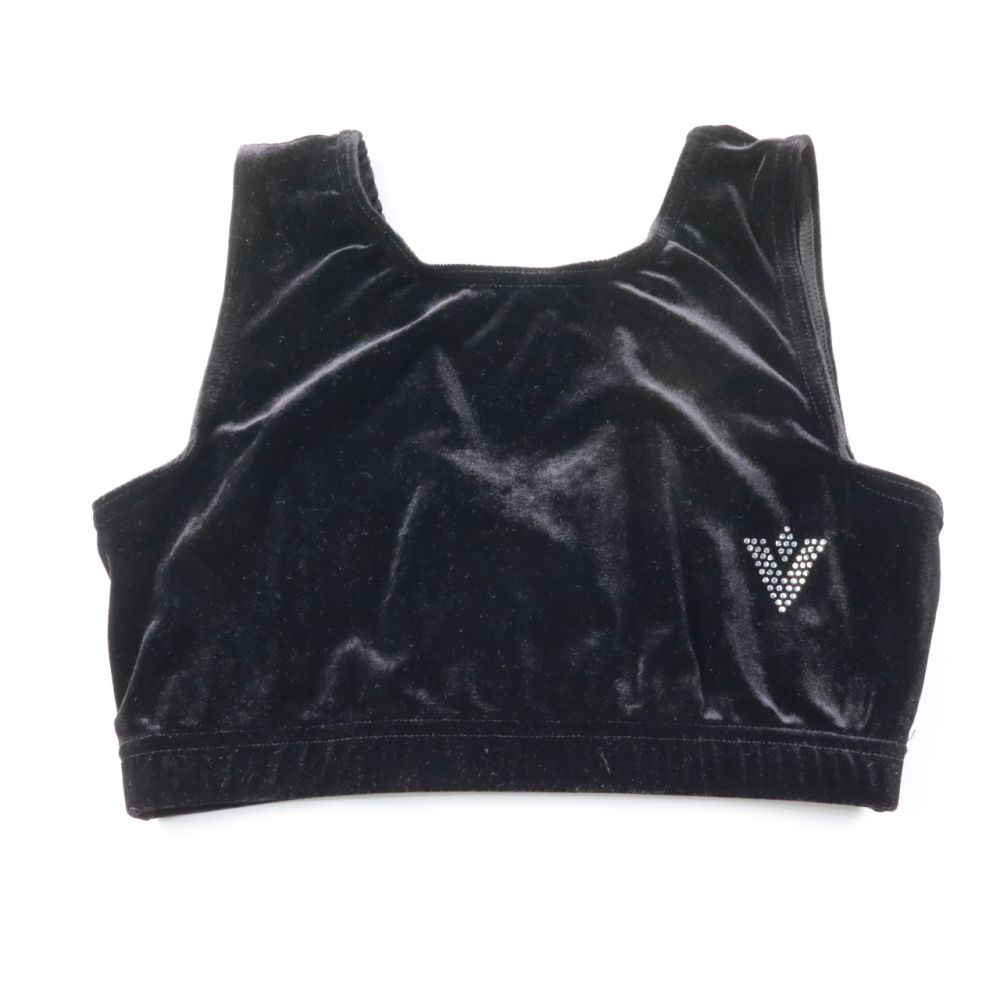 Детский топ Varsany из чёрного бархата с небольшим логотипом из страз. Подойдёт для занятий танцами/гимнастикой или как базовый топ под одежду. Плотная ткань держит форму и комфортно сидит на теле.