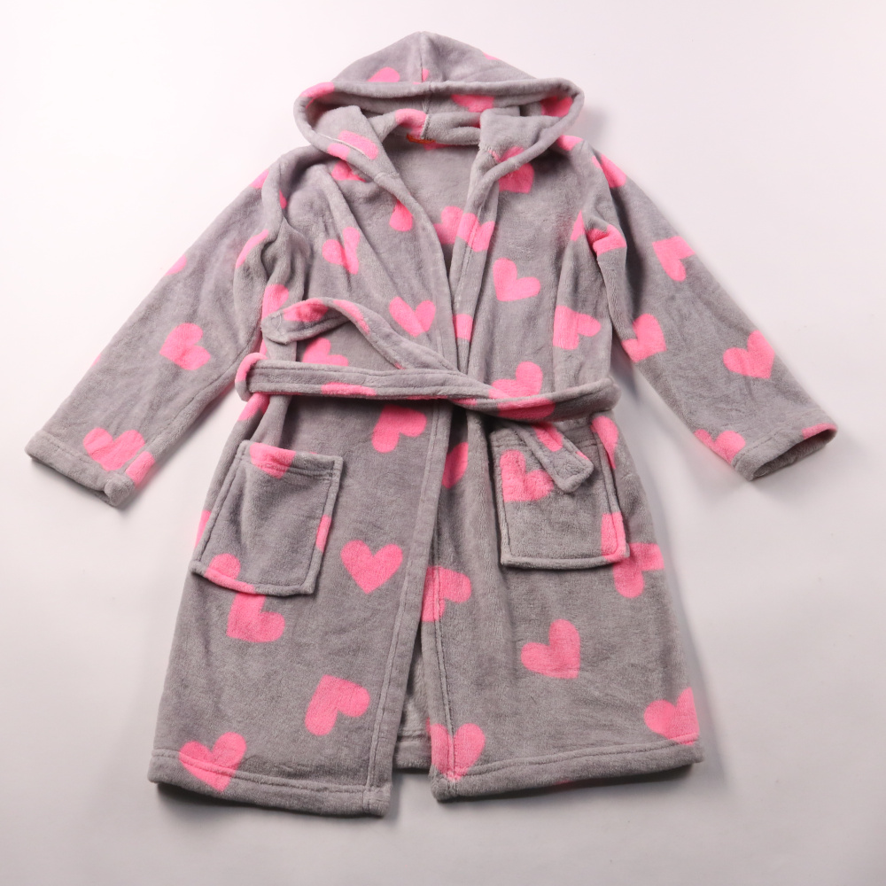 Детский халат Hema серого цвета с розовыми сердечками, с капюшоном, поясом и двумя карманами. Подойдёт для дома после душа/ванны и для уютных вечеров. Мягкий полиэстер быстро сохнет и прост в уходе.
