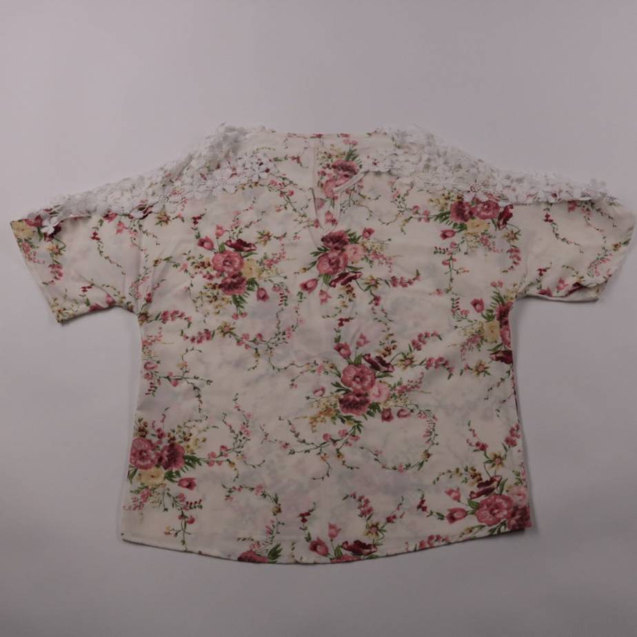 Лёгкая детская блузка с цветочным принтом и кружевной отделкой по линии плеч. Подойдёт для прогулок и летних праздников, хорошо сочетается с юбкой или шортами. Ткань тонкая и быстро сохнет после стирки.