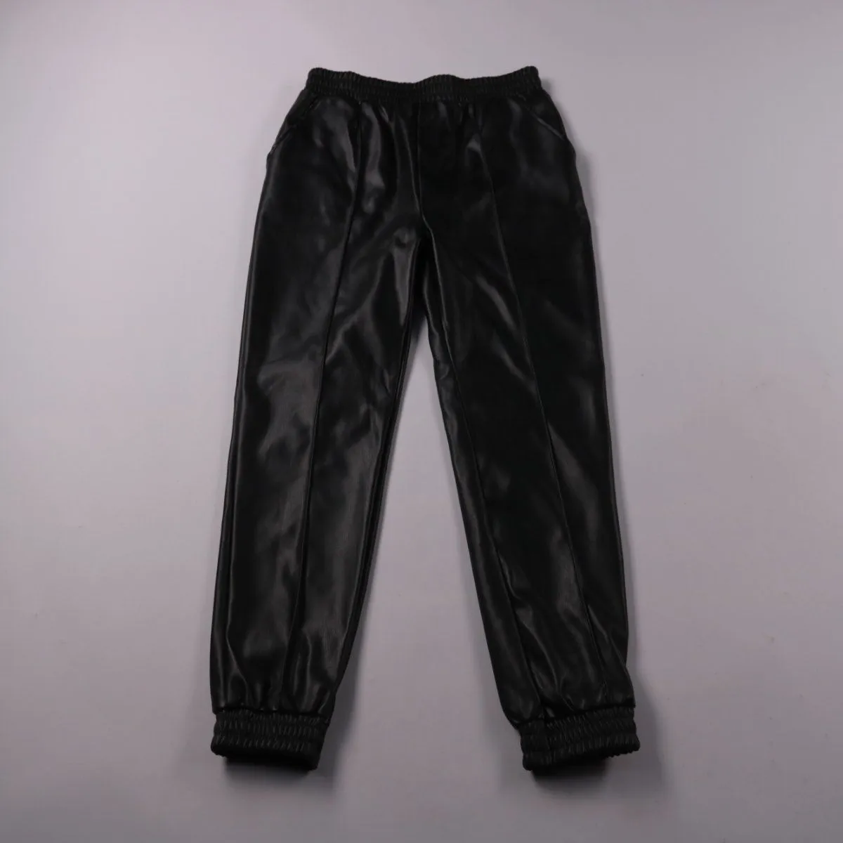 Брюки Primark из материала с покрытием под кожу, чёрного цвета, с эластичным поясом и манжетами снизу. Подойдут для повседневной носки в школу и на прогулки в прохладное время года. Практичны тем, что легко протираются и быстро приводятся в порядок.