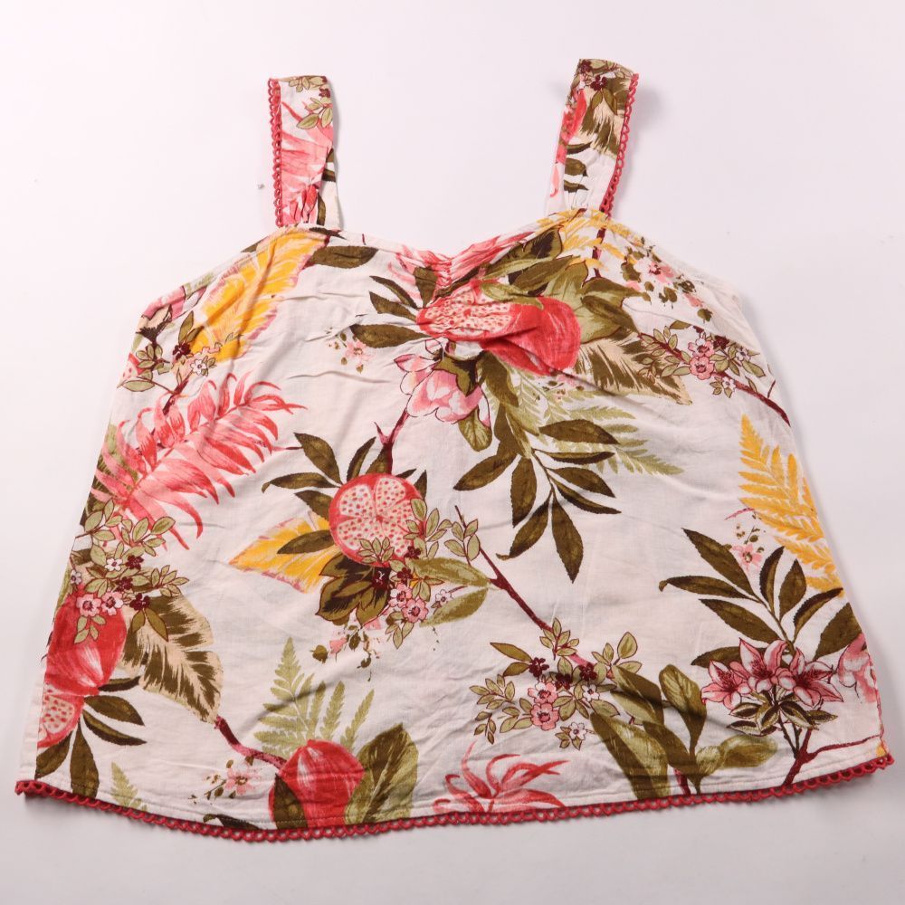 Летний топ Monsoon на бретелях с цветочным принтом и декоративной отделкой по краю. Подойдёт для прогулок и отдыха в тёплую погоду, хорошо сочетается с шортами или юбкой. Ткань с льном в составе хорошо дышит и комфортна в жару.