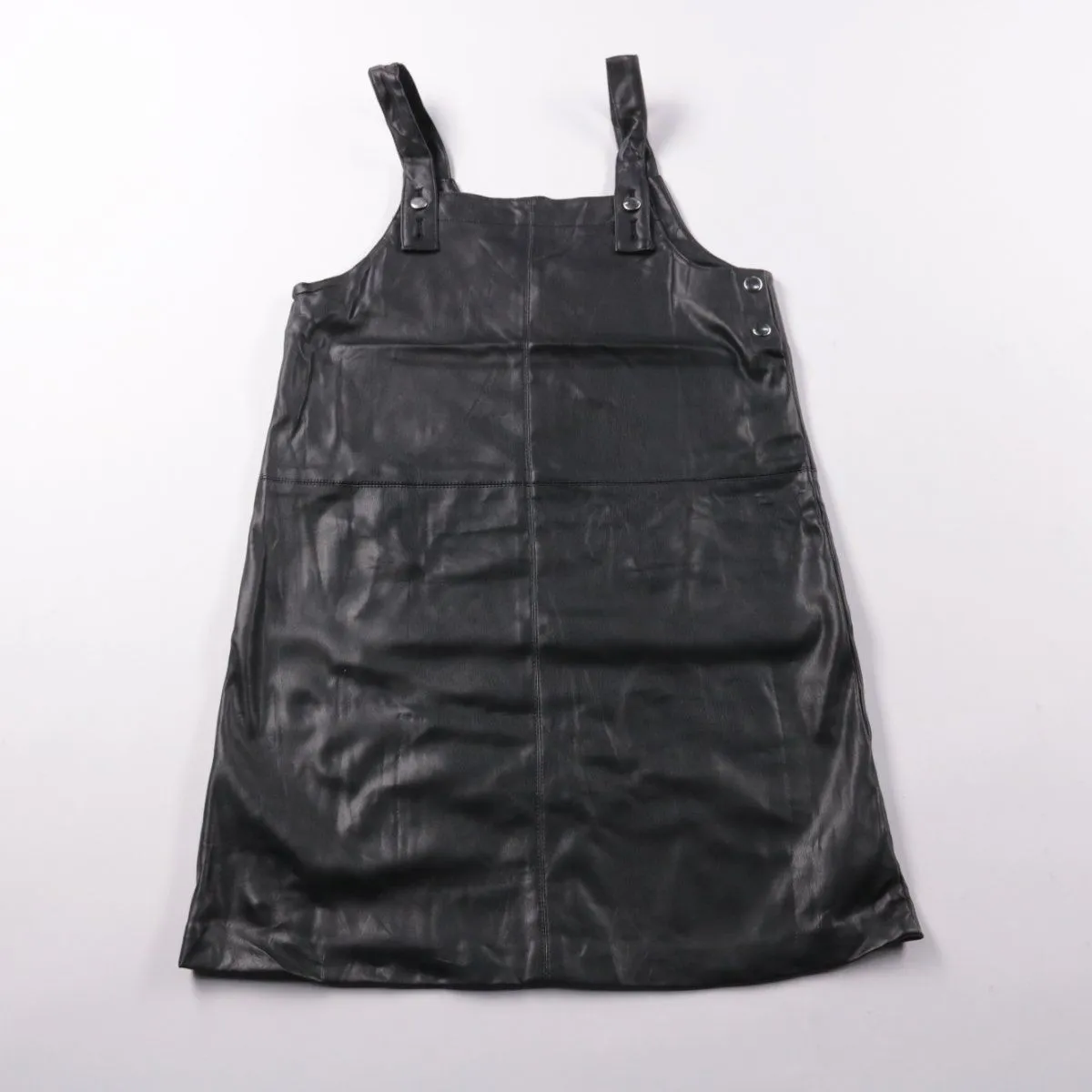Платье-сарафан Destination из искусственной кожи (полиуретан), чёрного цвета, на широких бретелях с кнопками. Подойдёт для школы, прогулок и праздничных выходов в демисезон, хорошо смотрится с водолазкой или лонгсливом. Материал легко протирать влажной салфеткой, что удобно в носке.