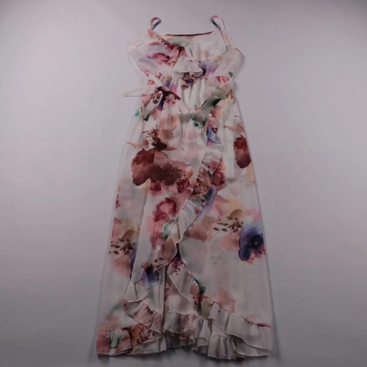 Летнее платье для девочки на тонких бретелях, с цветочным принтом и оборками, на поясе завязки. Подойдёт для прогулок и праздников в тёплую погоду. Ткань из полиэстера лёгкая и быстро сохнет.