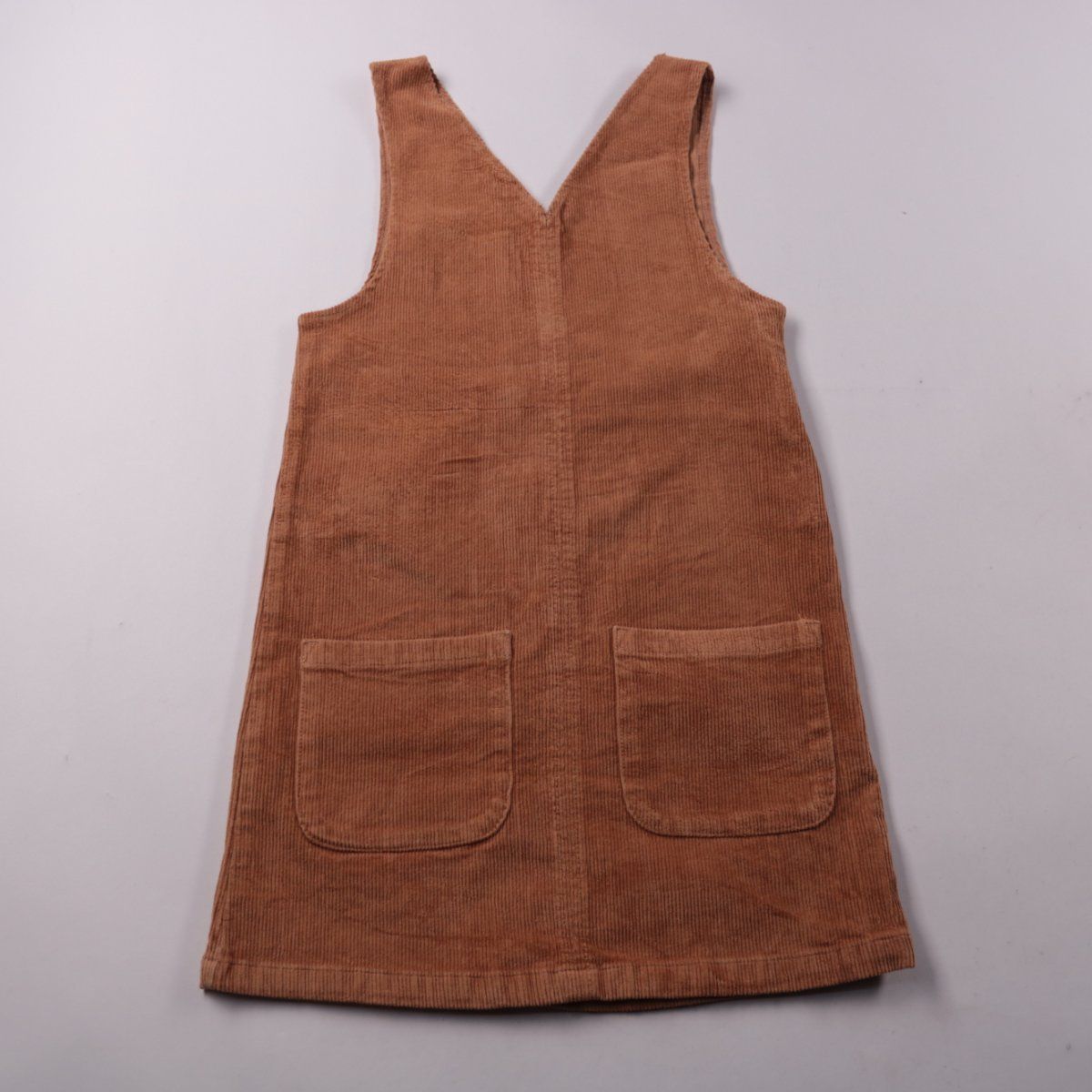 Детское платье-сарафан George из вельвета коричневого цвета, с V-образным вырезом и двумя накладными карманами спереди. Подойдёт для прогулок и садика, удобно носить поверх футболки или водолазки. Практичный материал хорошо держит форму и не требует сложного ухода.