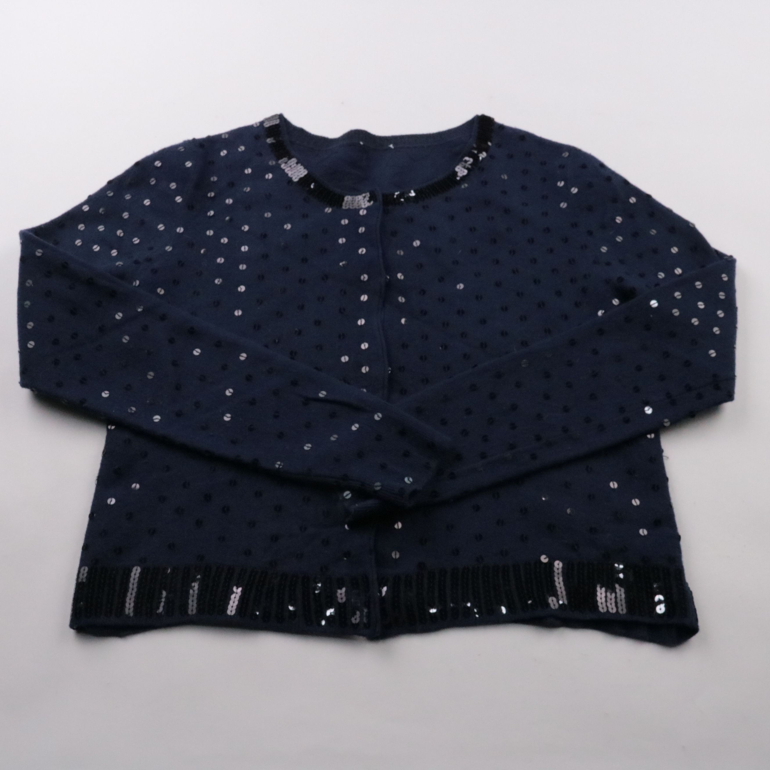 Детская кофта на девочку в темно-синем цвете с мелким рисунком и декоративными пайетками по краю. Подойдет для школы или повседневных прогулок в прохладную погоду. Мягкая и удобная, легко сочетается с брюками и юбками.