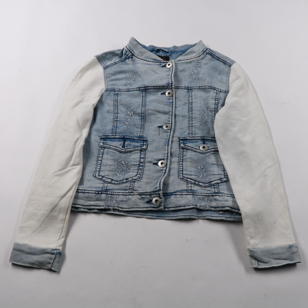 Джинсовка FB Sister в голубом цвете с белыми рукавами и застёжкой на пуговицы. Подойдёт для школы и прогулок в тёплую весну/осень, удобно носить поверх футболки или лонгслива. Практичные накладные карманы спереди — для мелочей.