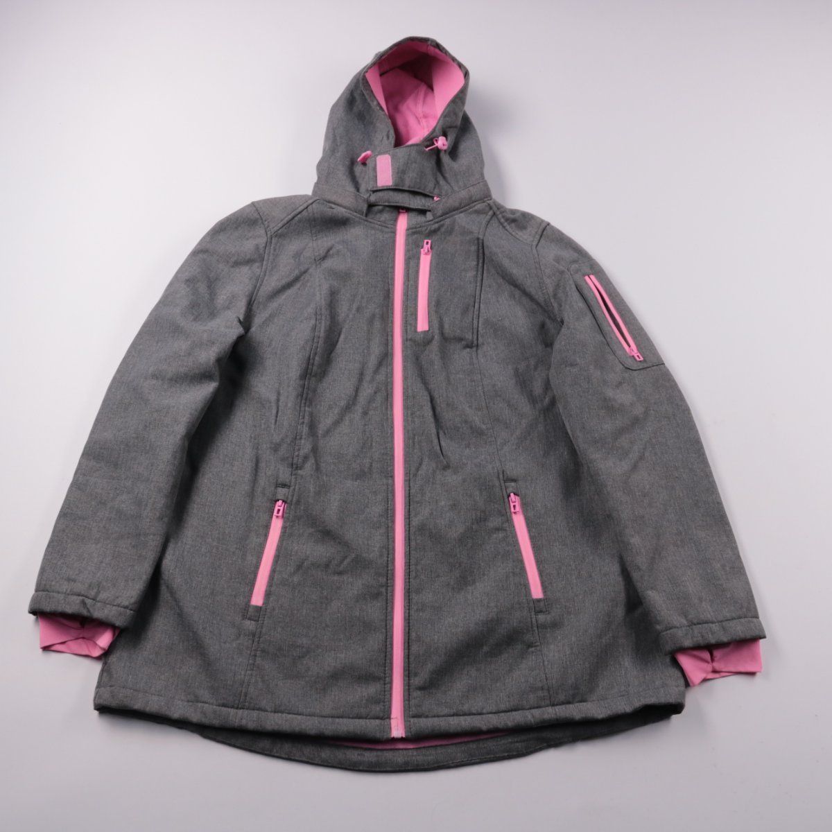 Демисезонная куртка Janina серого цвета с ярко-розовыми молниями и подкладкой, с капюшоном и несколькими карманами на молнии. Подойдёт для прогулок и школы в прохладную погоду. Практична тем, что застёгивается на молнию и легко сочетается с повседневной одеждой.