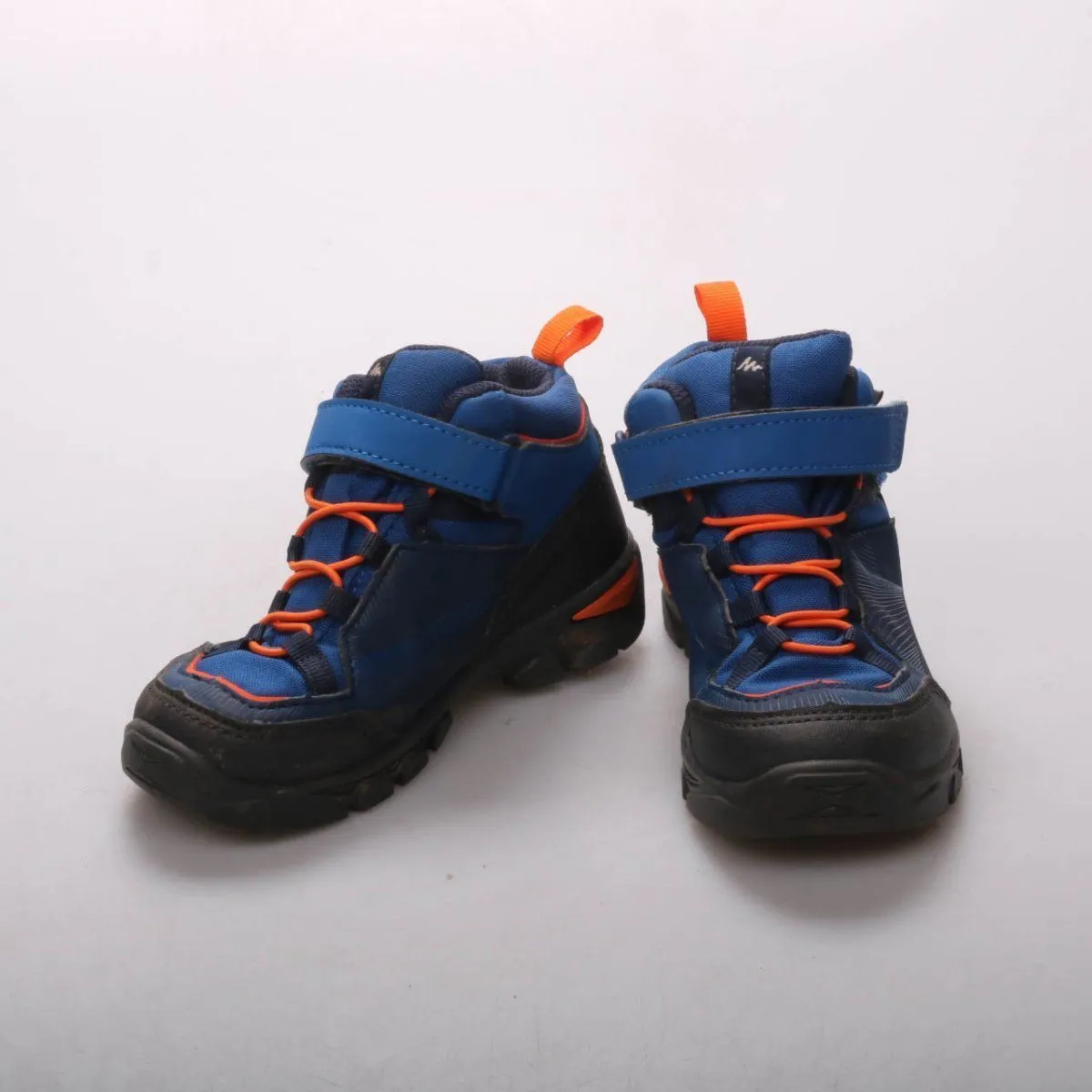 Детские демисезонные ботинки Quechua в синем цвете с оранжевыми шнурками и липучкой для быстрой фиксации. Подойдут для прогулок и активных игр на улице в прохладную погоду. Усиленный нос и рельефная подошва помогают лучше защищать стопу и держать сцепление.