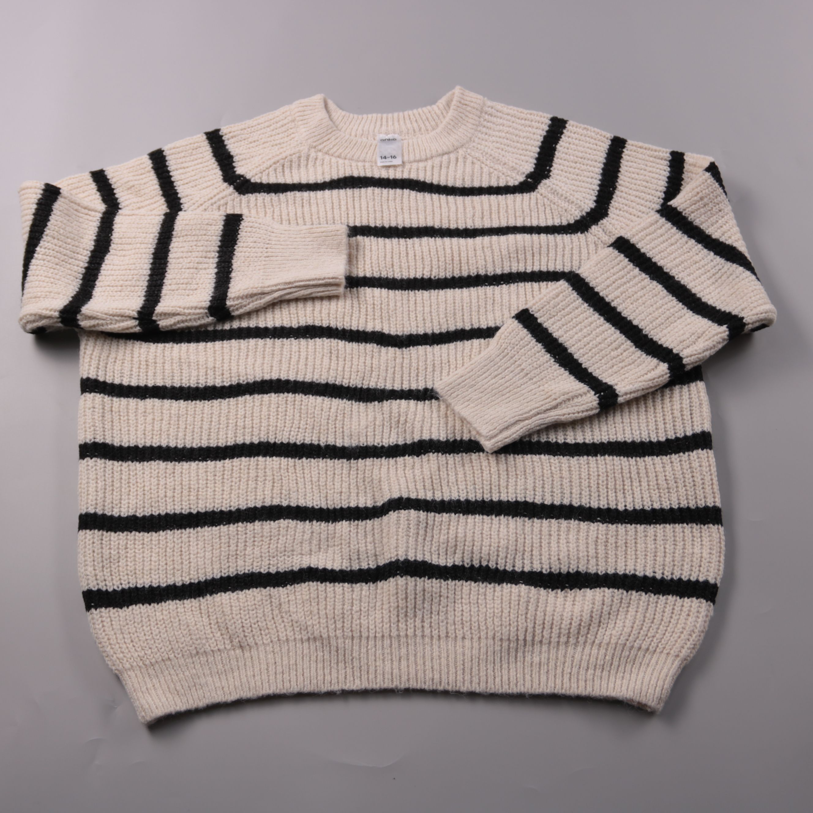 Вязаный свитер Anko молочного цвета в чёрную полоску, размер 14–16. Подойдёт для школы и прогулок в прохладную погоду, хорошо смотрится с джинсами и брюками. Плотная вязка делает его тёплым и практичным в носке.