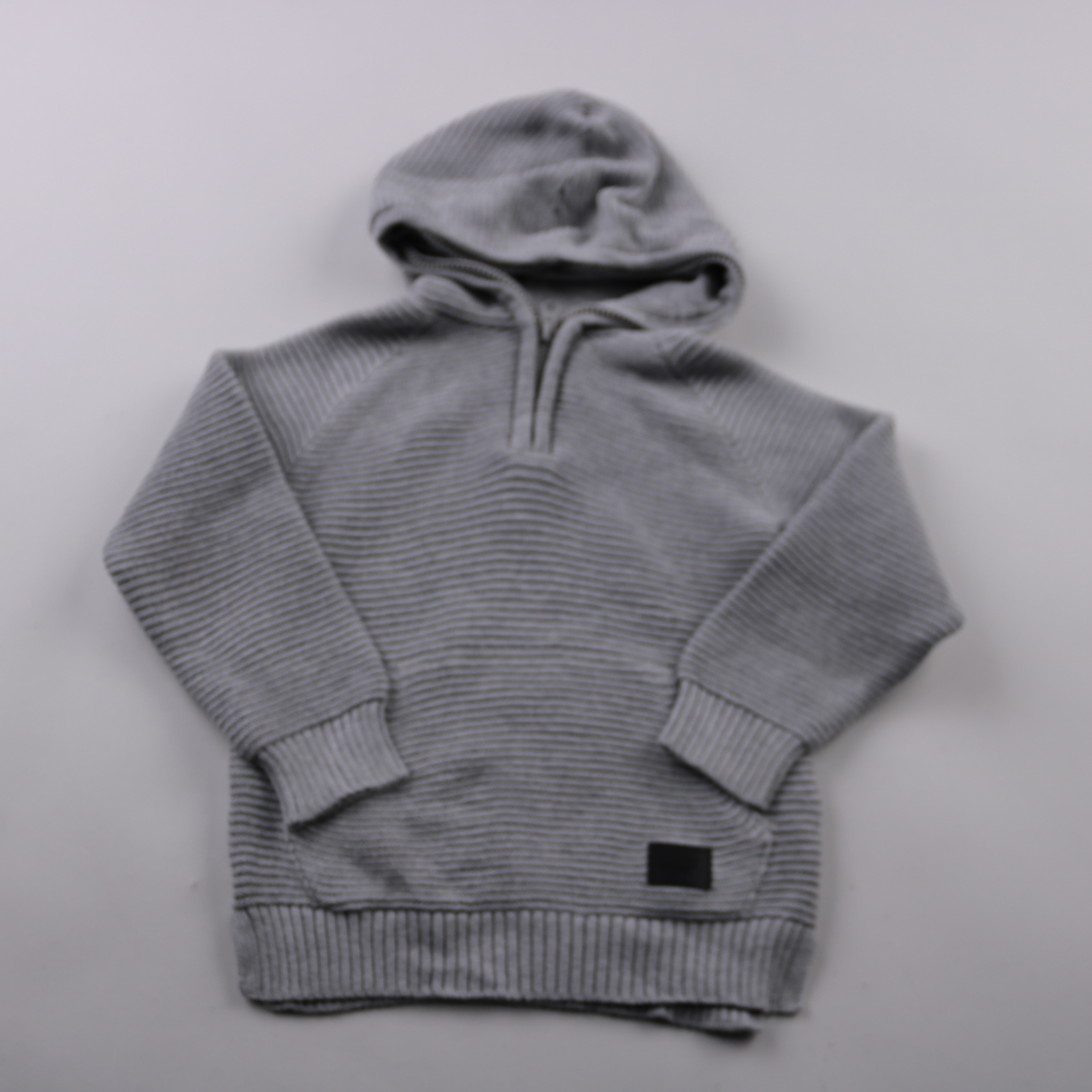 Худи H&M из плотного трикотажа в рубчик, серого цвета, с капюшоном и короткой молнией у горла. Подойдёт для прогулок и в садик в прохладную погоду, удобно надевать как второй слой. Манжеты и низ на резинке помогают держать форму и лучше защищают от ветра.