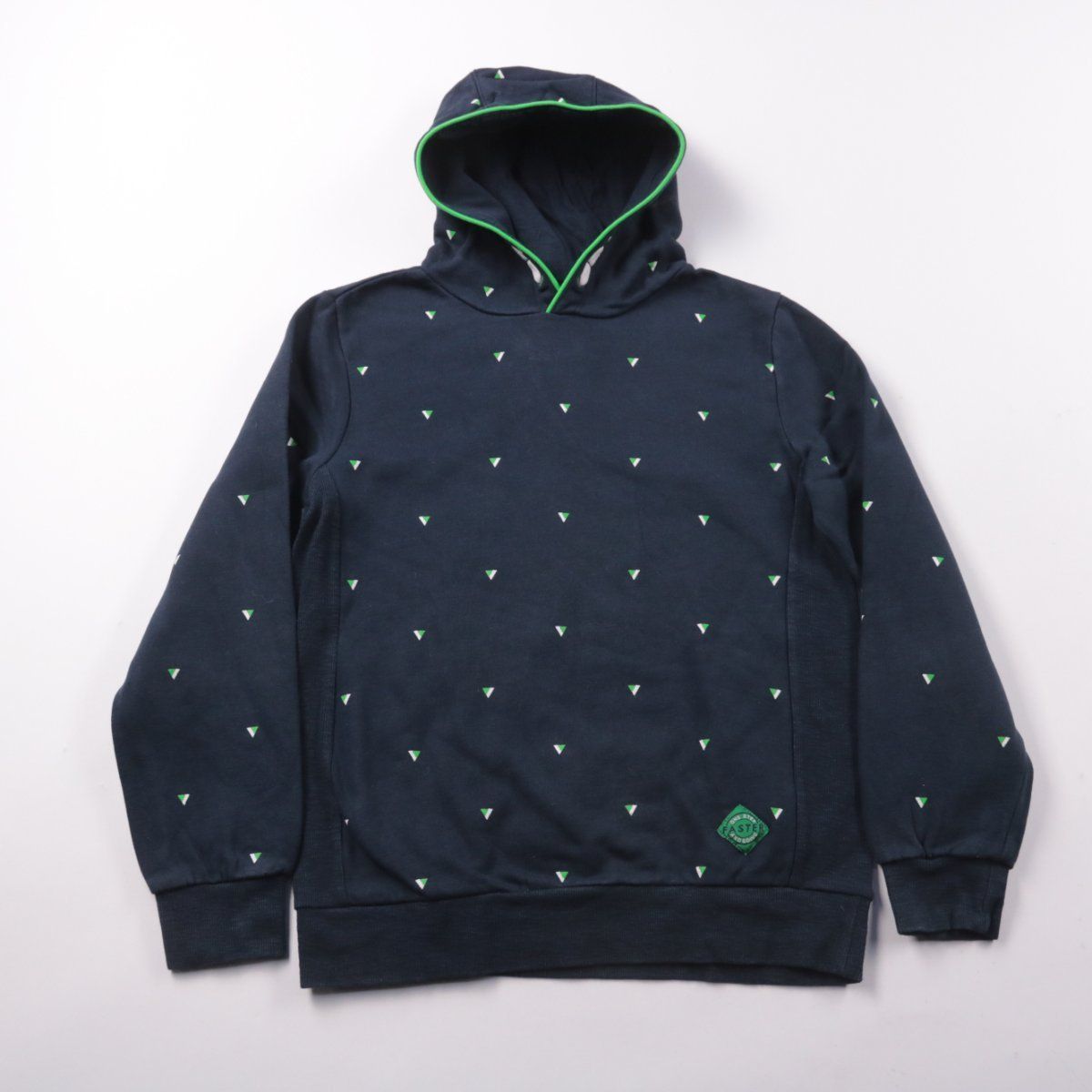 Толстовка-худи WE тёмно-синего цвета с мелким принтом и капюшоном, отделка по краю капюшона зелёной окантовкой. Подойдёт для школы и повседневной носки в прохладную погоду. Плотный хлопок хорошо дышит и прост в уходе.