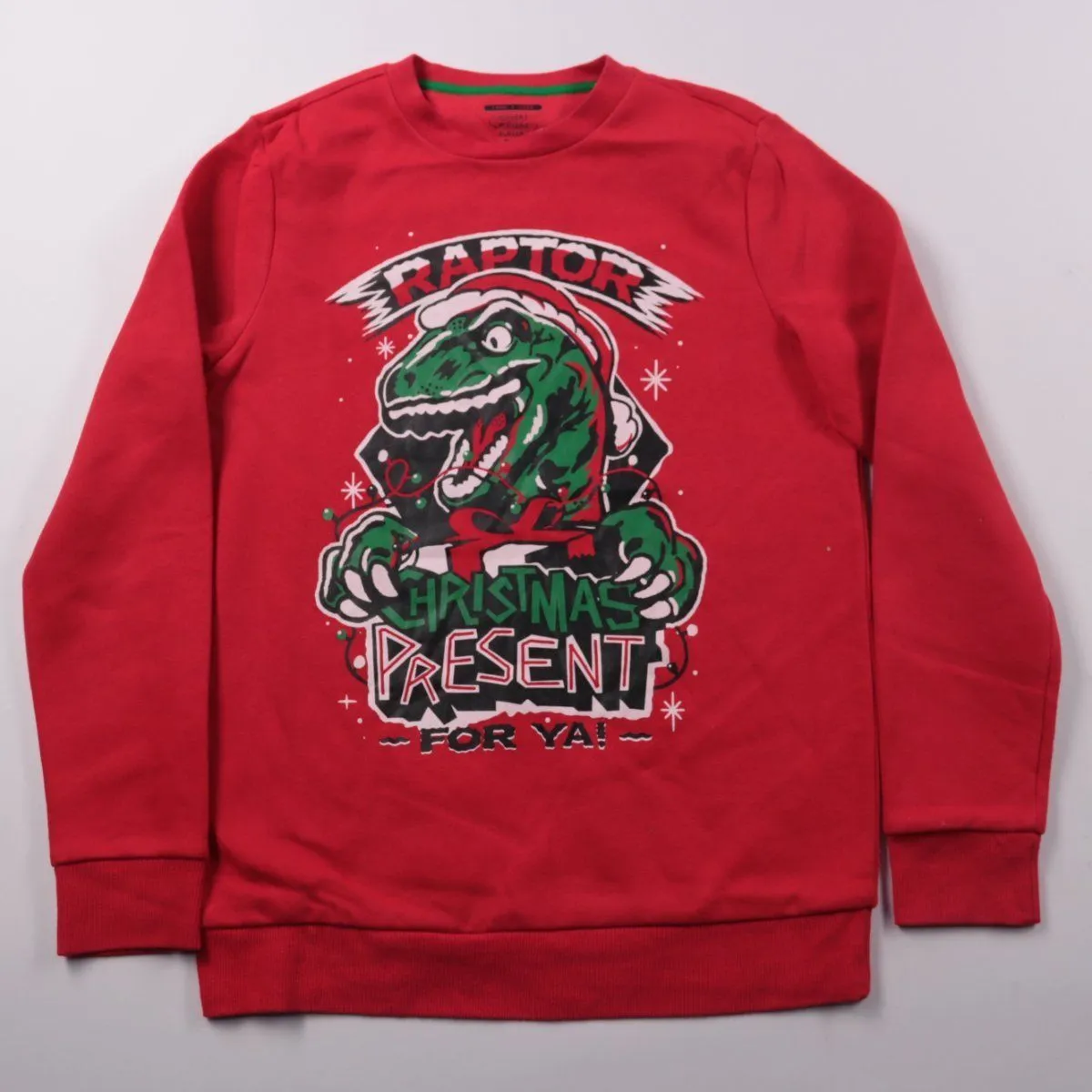 Толстовка F&F для мальчика красного цвета с новогодним принтом динозавра и надписью. Подойдёт для школы, прогулок и праздничных дней в прохладную погоду. Мягкий трикотаж и манжеты на рукавах делают посадку удобной и держат тепло.