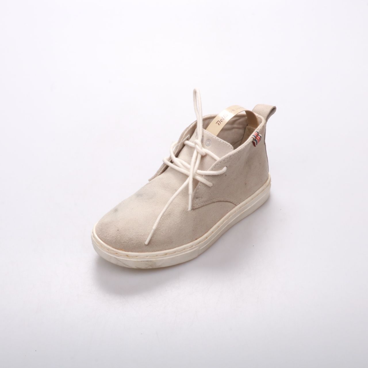 Кеды Delize из светло-серой замши на шнуровке и с мягким задником-петлёй. Подойдут для повседневной носки в городе в демисезон. Резиновая подошва практична и легко очищается, есть заметные следы носки и загрязнения.