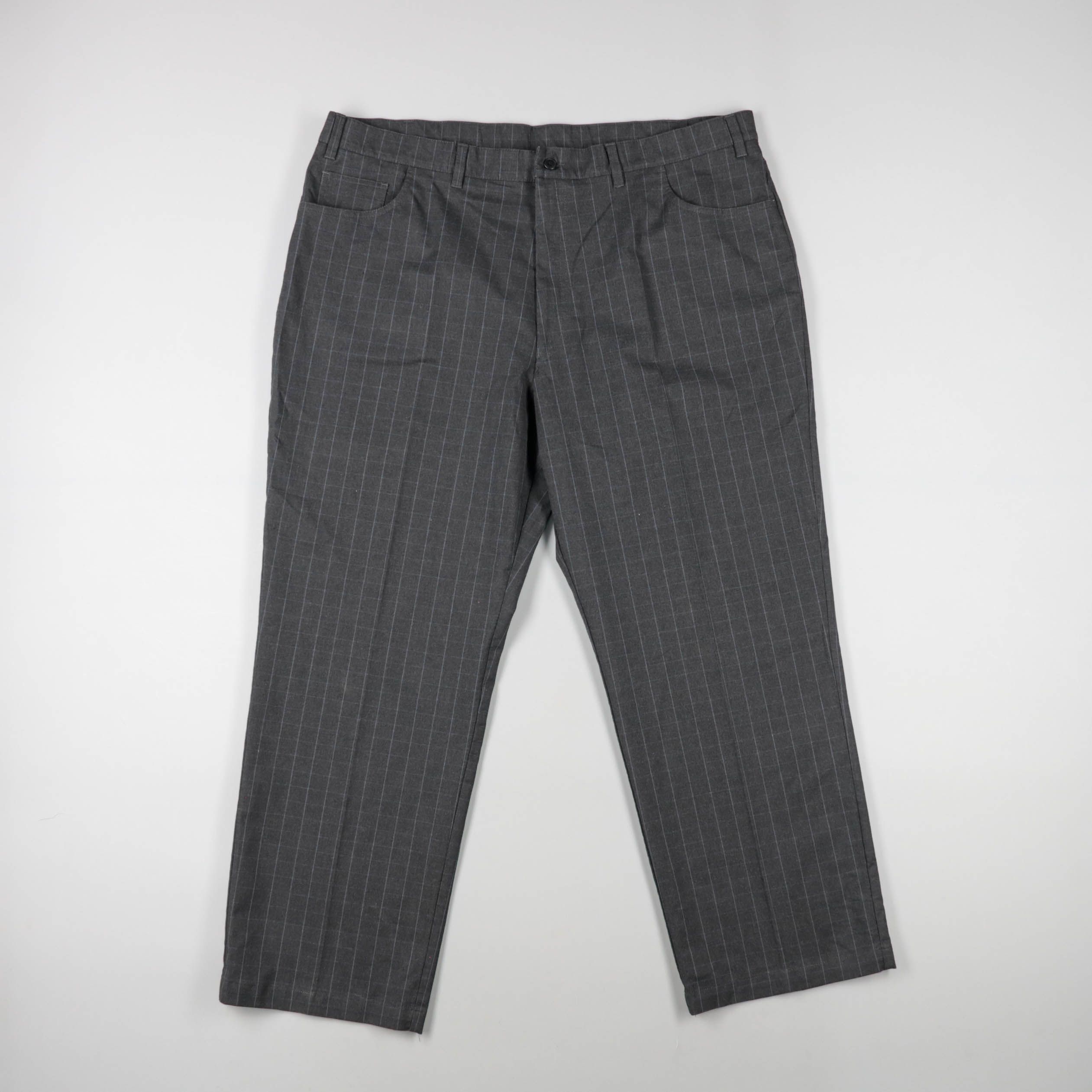 Мужские классические брюки в сером цвете с тонкой вертикальной полоской. Подойдут для офиса и деловых встреч, хорошо сочетаются с рубашкой и пиджаком. Практичные: немаркий оттенок и удобные карманы на каждый день.