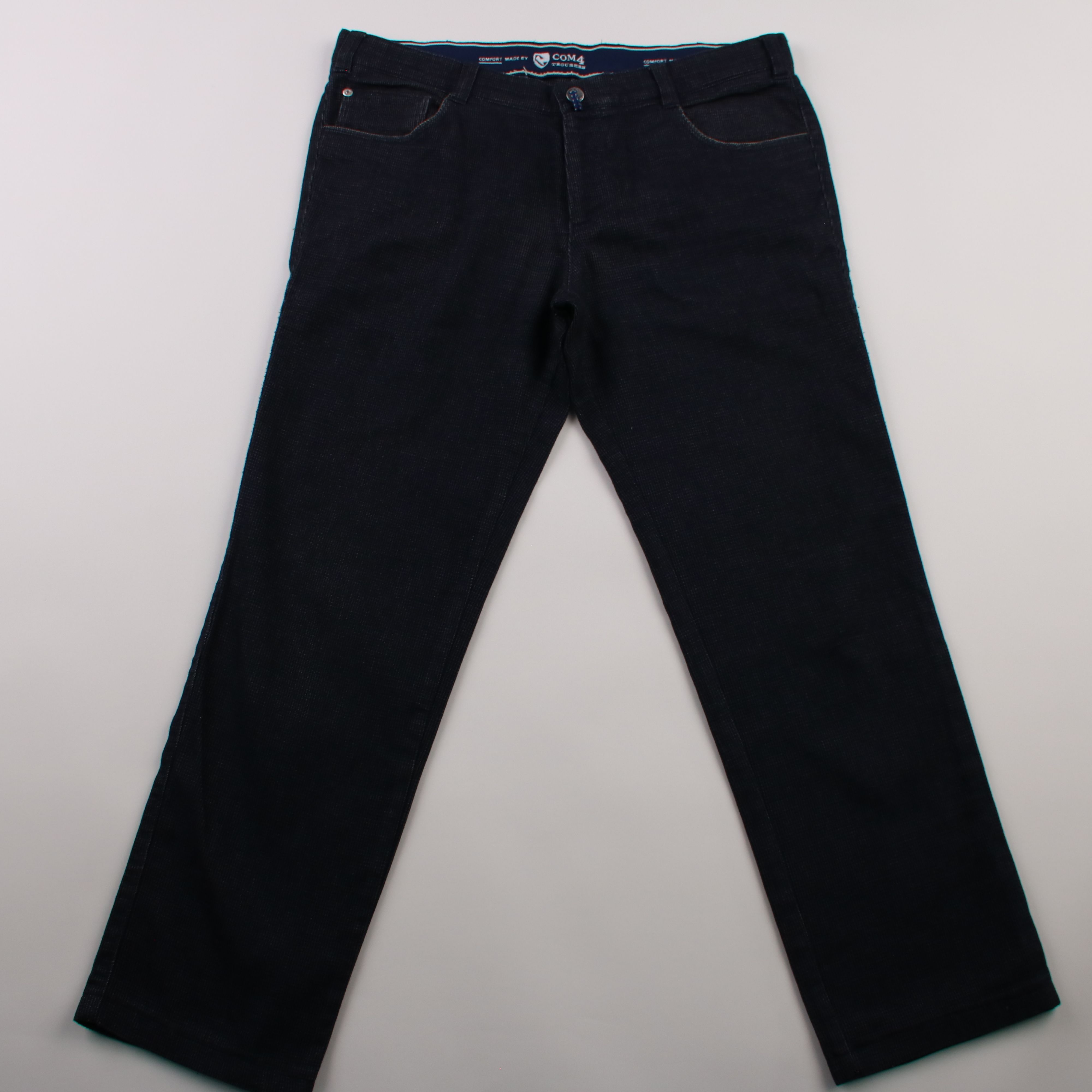 Мужские брюки Com4 в тёмно-синем (почти чёрном) цвете с фактурной тканью и классической посадкой на молнии и пуговице. Подойдут для офиса и повседневных образов в стиле smart casual, хорошо сочетаются с рубашкой или джемпером. Практичный плюс — ткань с...