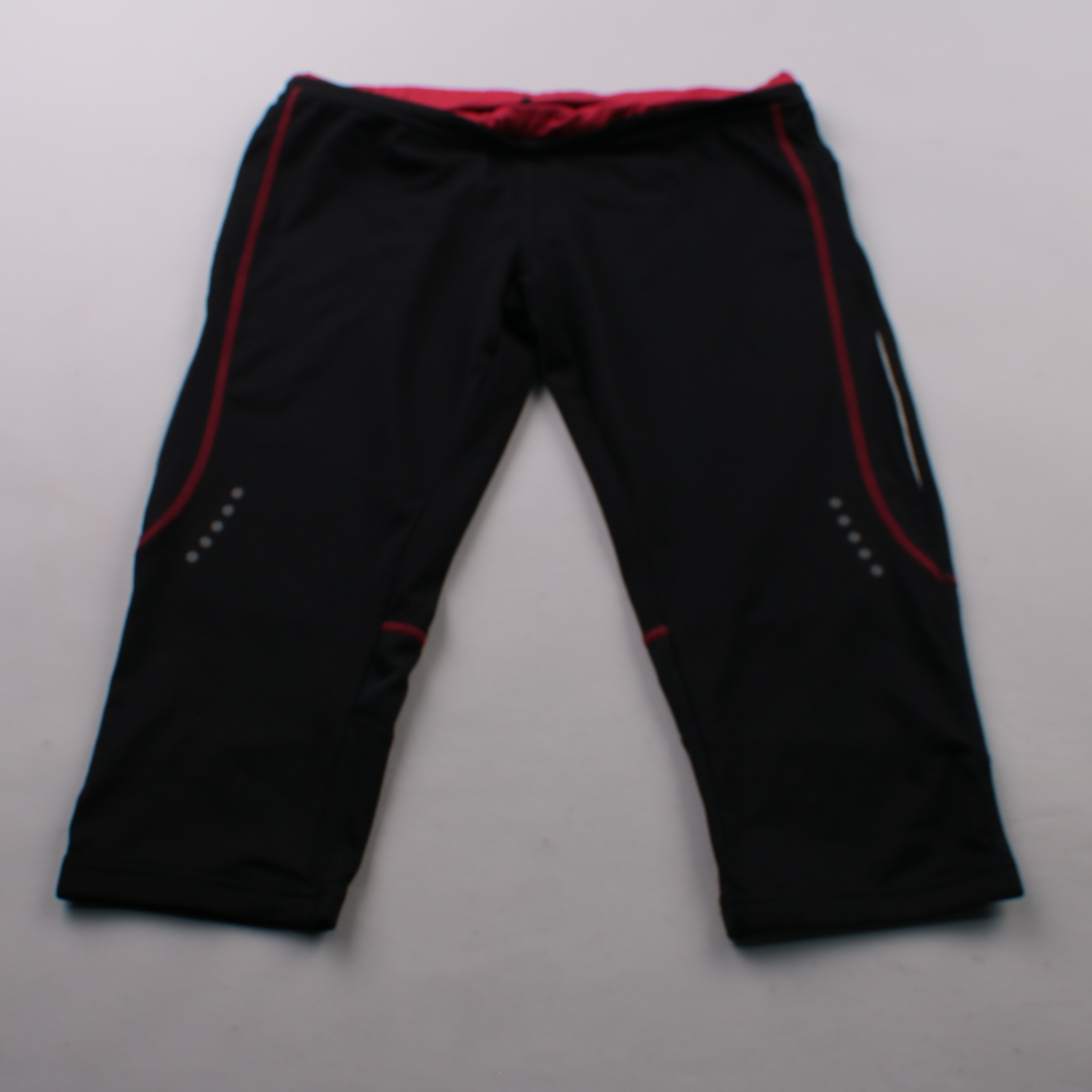 Спортивные брюки Crivit чёрного цвета с красными вставками и отражающими элементами. Подойдут для бега и тренировок в зале, а эластичный материал не сковывает движения и быстро сохнет.