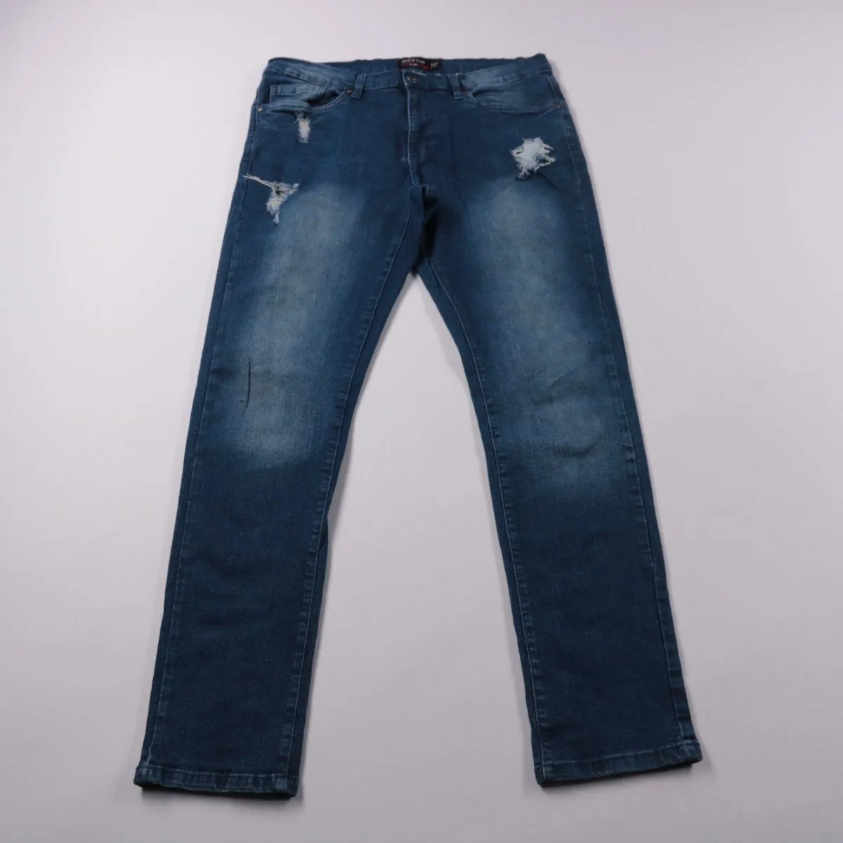 Мужские джинсы Identic из денима синего цвета, модель slim с лёгкими потертостями и декоративными разрывами спереди. Подойдут для повседневных образов в городе и на выход, хорошо смотрятся с кедами или ботинками. Практичный материал и классическая посадка делают их удобными на каждый день.