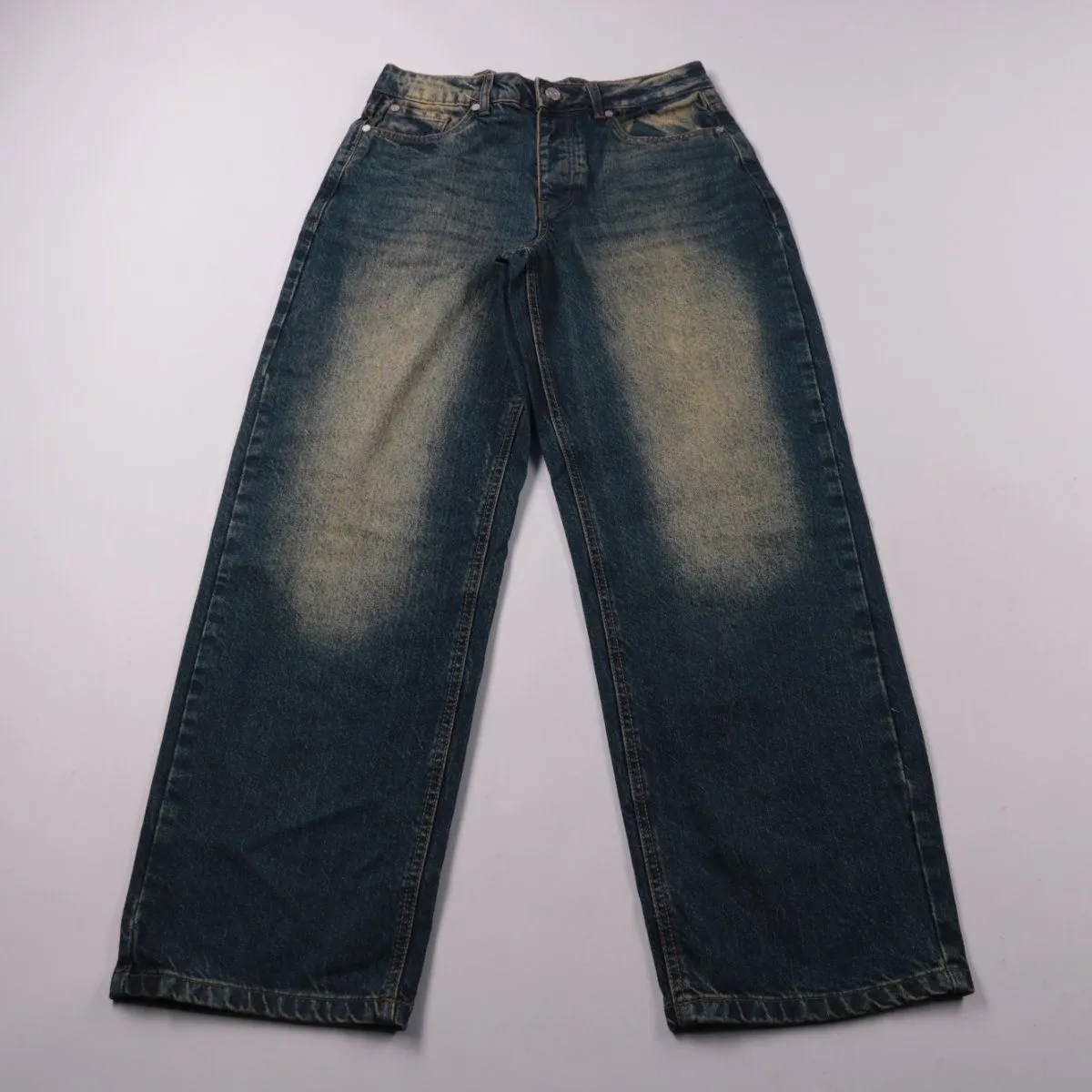 Мужские джинсы BoohooMAN из плотного синего денима с выраженными высветлениями спереди. Подойдут для повседневных образов в стиле casual, хорошо сочетаются с худи, футболками и кедами. Натуральный хлопок комфортен в носке и хорошо держит форму.