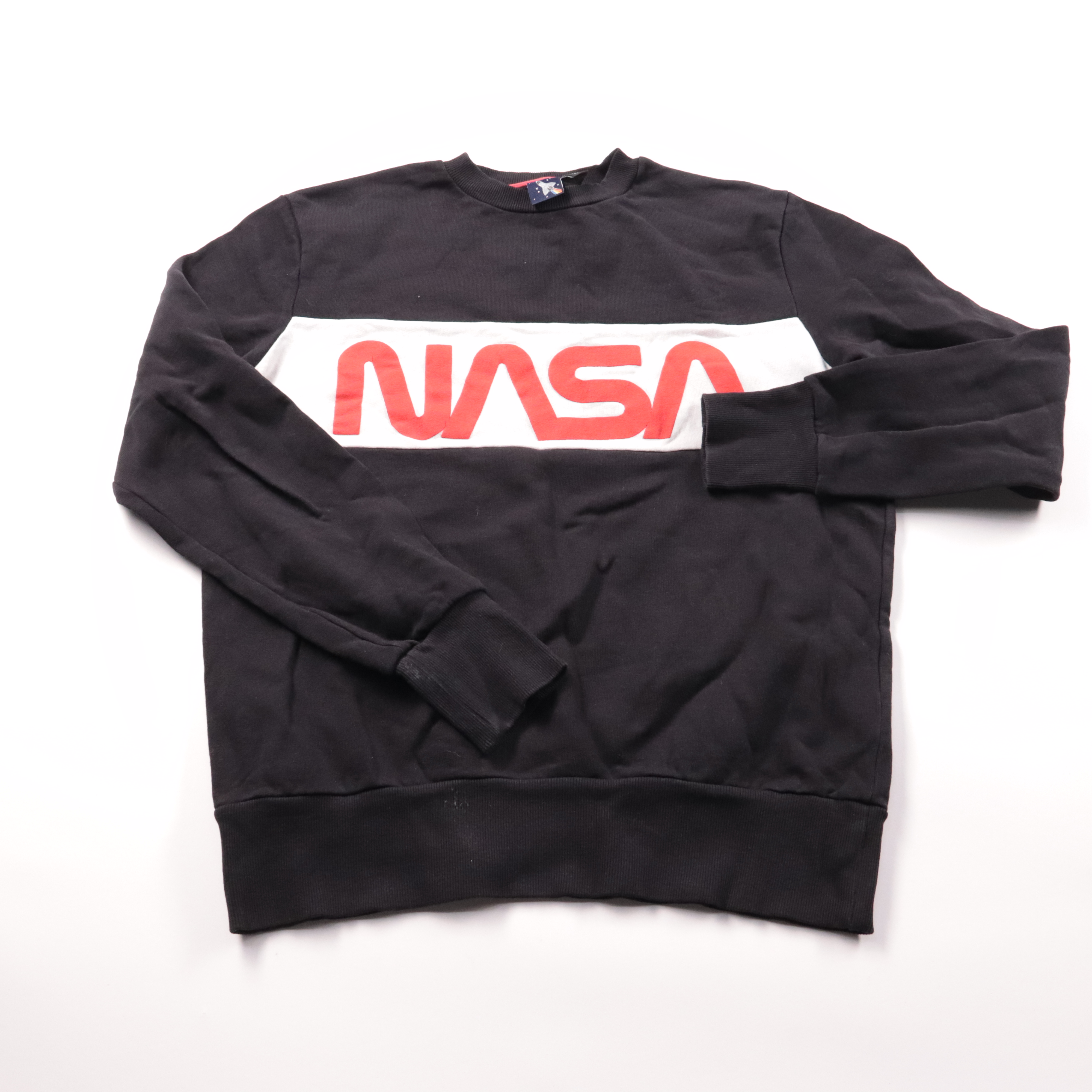 Свитшот Primark чёрного цвета с крупным принтом NASA на груди. Подойдёт для повседневной носки в прохладную погоду и для прогулок. Мягкий хлопковый материал и манжеты на рукавах помогают держать форму и комфортно сидят.