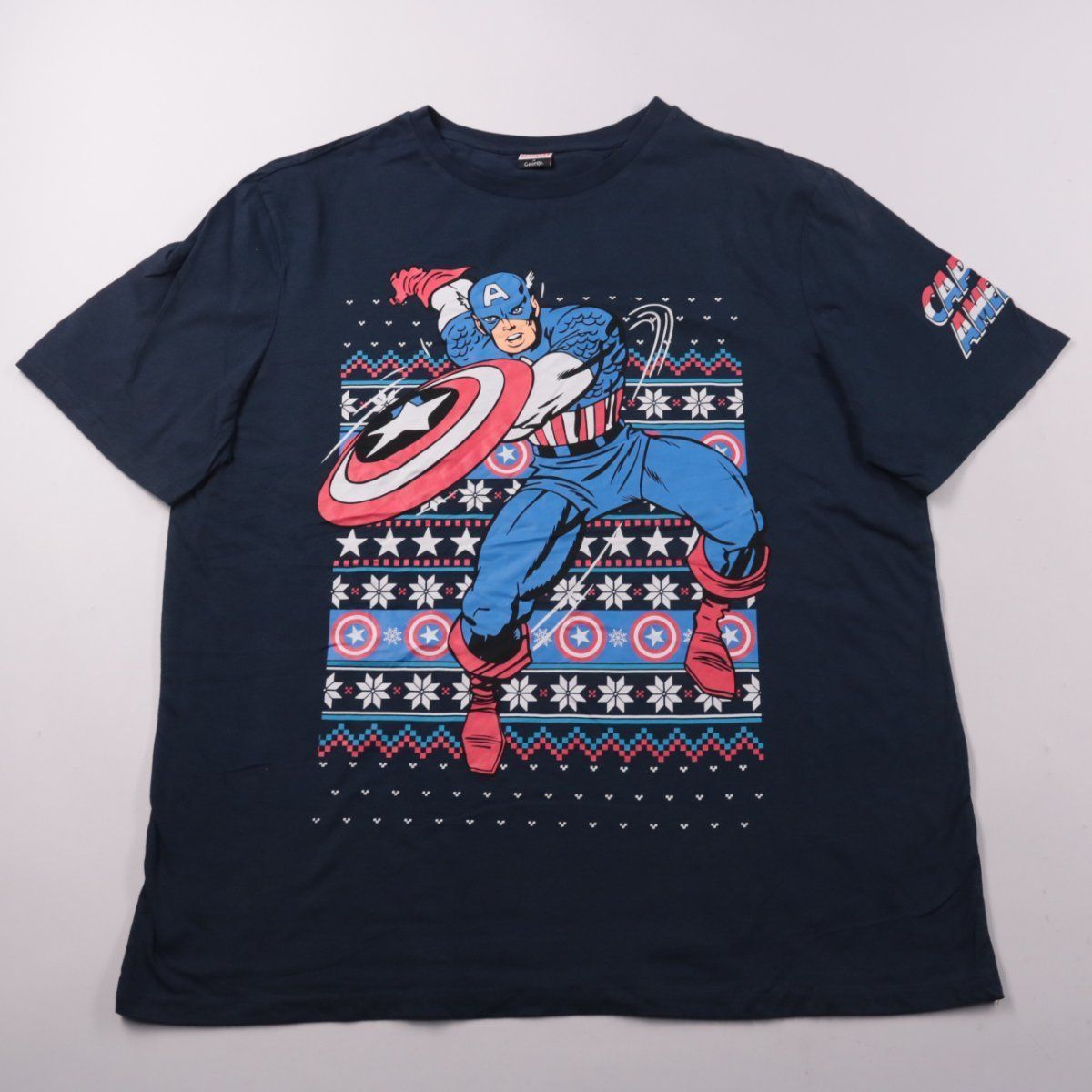 Мужская футболка George (Marvel) тёмно-синего цвета с крупным принтом Captain America в стиле «свитерного» орнамента. Подойдёт для повседневной носки и фанатам Marvel. Выполнена из 100% хлопка, хорошо дышит и комфортна в течение дня.