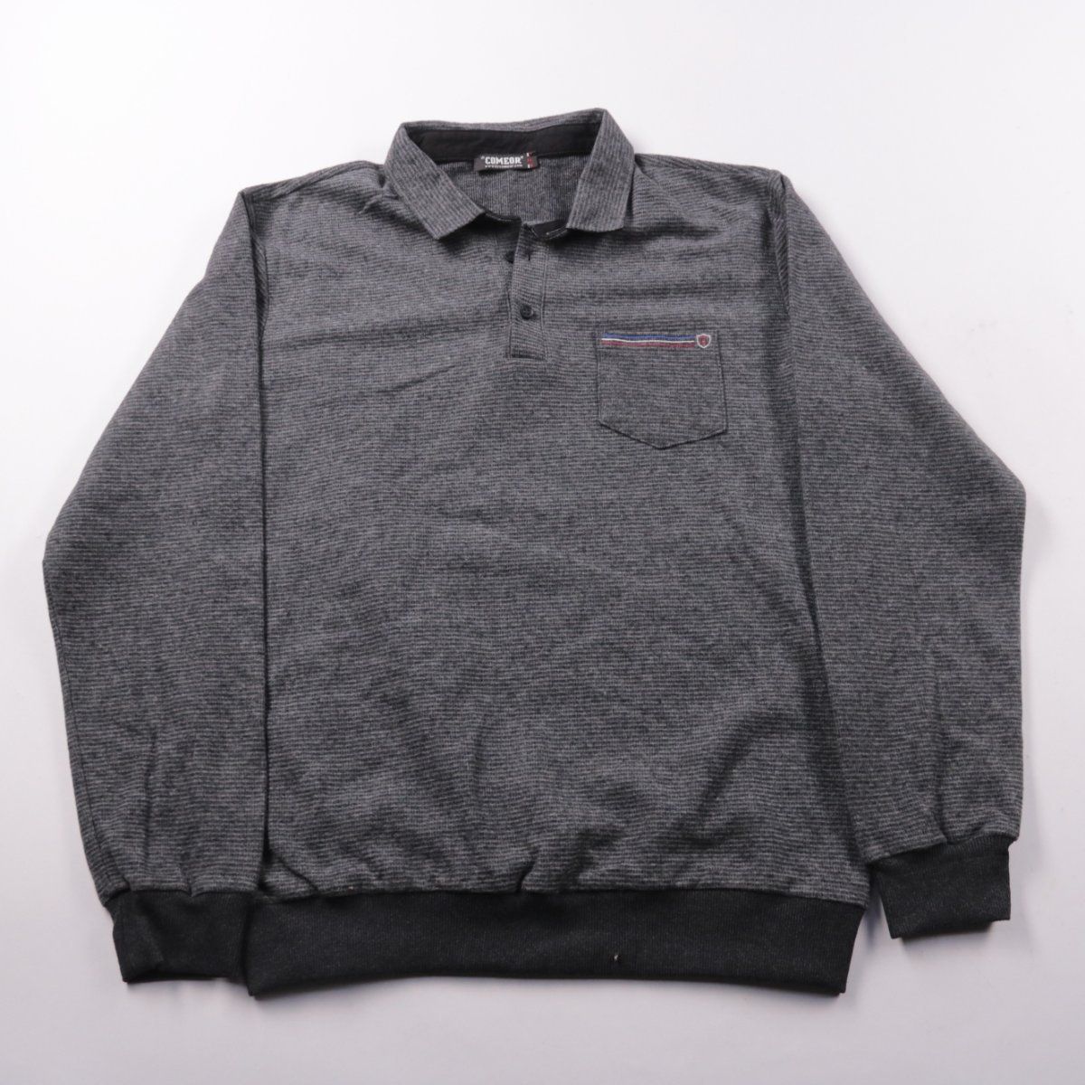 Мужское поло Comeor с длинным рукавом и воротником на пуговицах, в тёмно-сером меланже. Подойдёт для повседневной носки в прохладную погоду и для офиса в стиле casual. Практичный плюс — смесовая ткань легче в уходе и меньше мнётся.