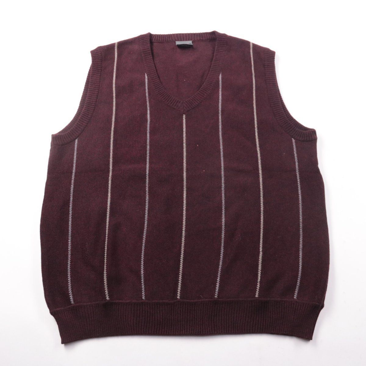 Мужской трикотажный жилет GLER бордового цвета с V-образным вырезом и тонкими вертикальными полосками. Подойдёт для офиса и повседневной носки поверх рубашки или лонгслива в прохладную погоду. Практичен тем, что удобно наслаивается и не сковывает движения рук.
