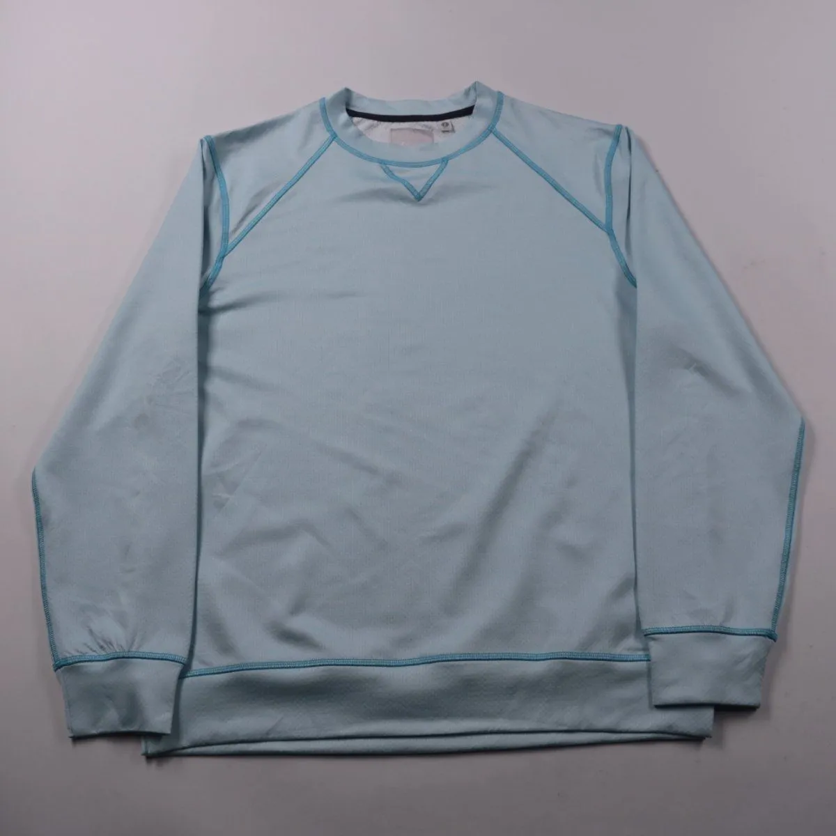 Свитшот Bruki светло-голубого цвета с реглан-рукавом и контрастными плоскими швами. Подойдёт для тренировок и повседневной носки, ткань тянется и комфортно сидит. Практичное преимущество — синтетический материал быстро сохнет и прост в уходе.