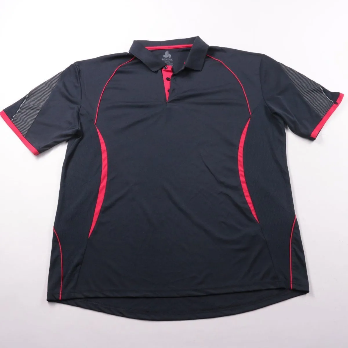 Мужское поло Biz Cool спортивного кроя: чёрное с красными вставками и контрастными деталями на рукавах. Подойдёт для тренировок, активного отдыха и повседневной носки в тёплую погоду. Лёгкий полиэстер быстро сохнет и прост в уходе.