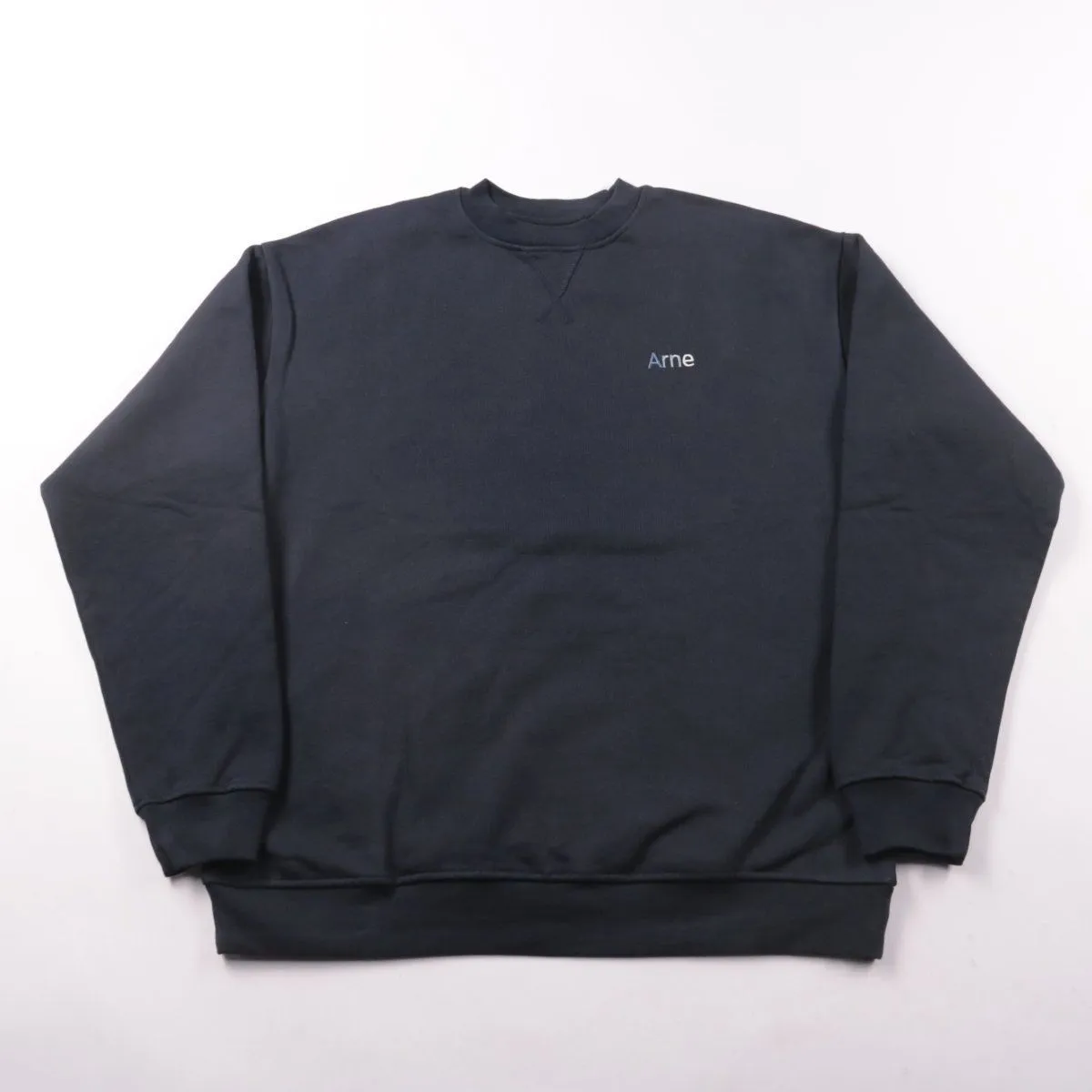 Мужской свитшот ARNE тёмно-синего цвета с небольшим логотипом на груди. Подойдёт для повседневной носки и многослойных образов в прохладную погоду. Плотный хлопковый футер помогает сохранять тепло и комфортно носится.