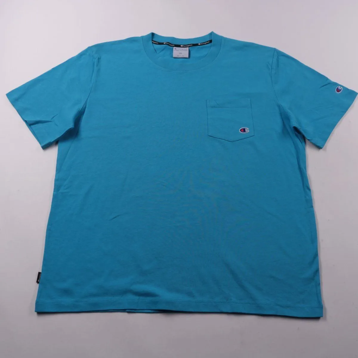 Мужская футболка Champion голубого цвета с нагрудным карманом и небольшими логотипами. Подойдёт для повседневной носки и прогулок в тёплую погоду, легко сочетается с джинсами и шортами. Хлопковая ткань хорошо дышит и проста в уходе.