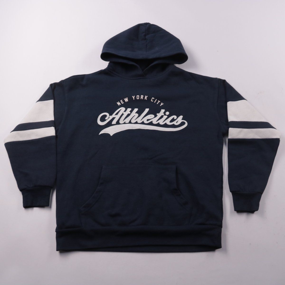 Мужское худи New Look тёмно-синего цвета с принтом New York City Athletics и карманом-кенгуру. Подойдёт для повседневной носки и прогулок в прохладную погоду, комфортно сидит за счёт мягкой трикотажной ткани. Практичный плюс — капюшон и эластичные манжеты помогают лучше сохранять тепло.