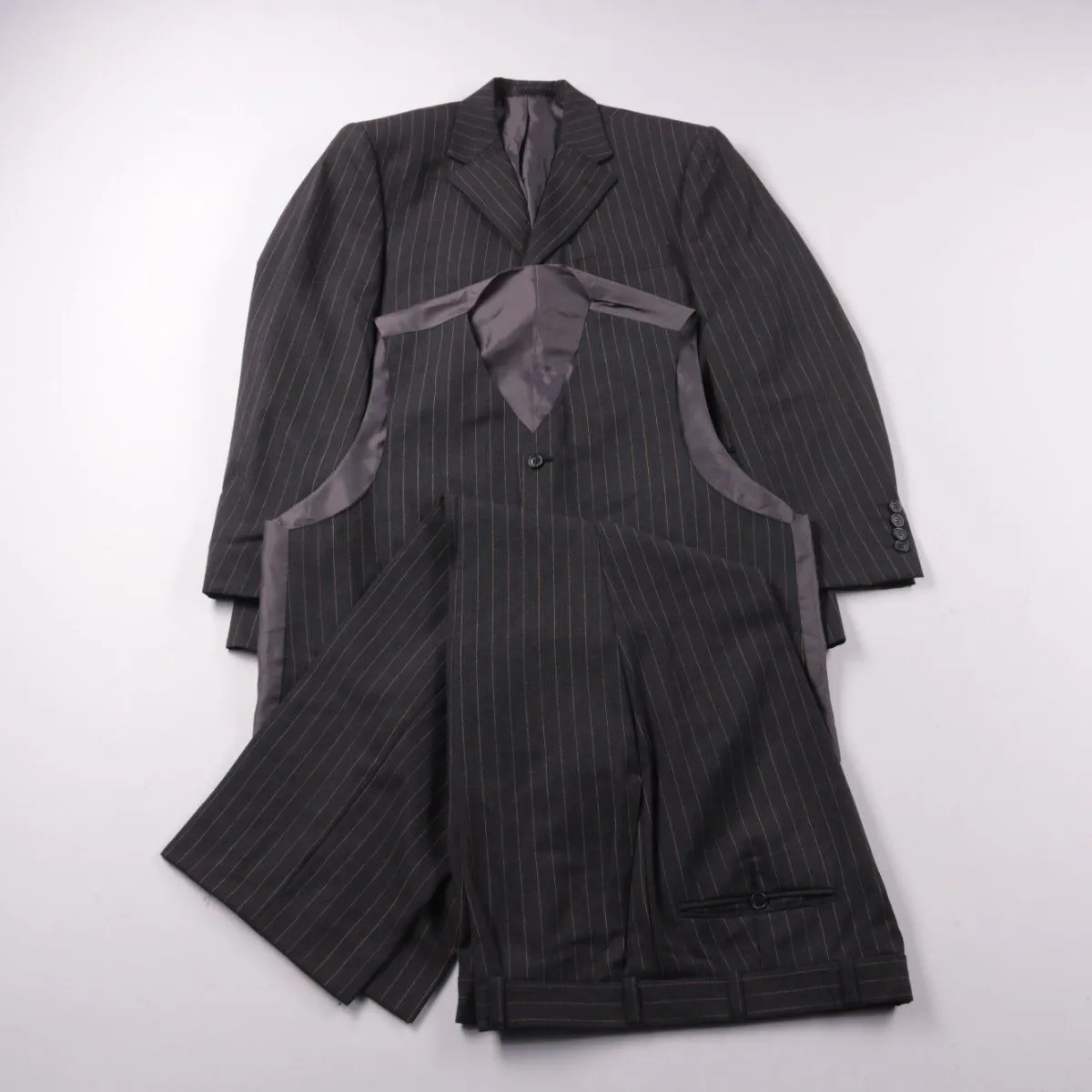 Мужской костюм Canda (C&A) тёмно-серого цвета в тонкую полоску, в комплекте пиджак, жилет и брюки. Подойдёт для офиса и деловых мероприятий, благодаря классическому крою легко сочетается с рубашками и галстуками. Ткань из новой шерсти Woolmark, подкладка 100% полиэстер — практичен в носке и держит форму.