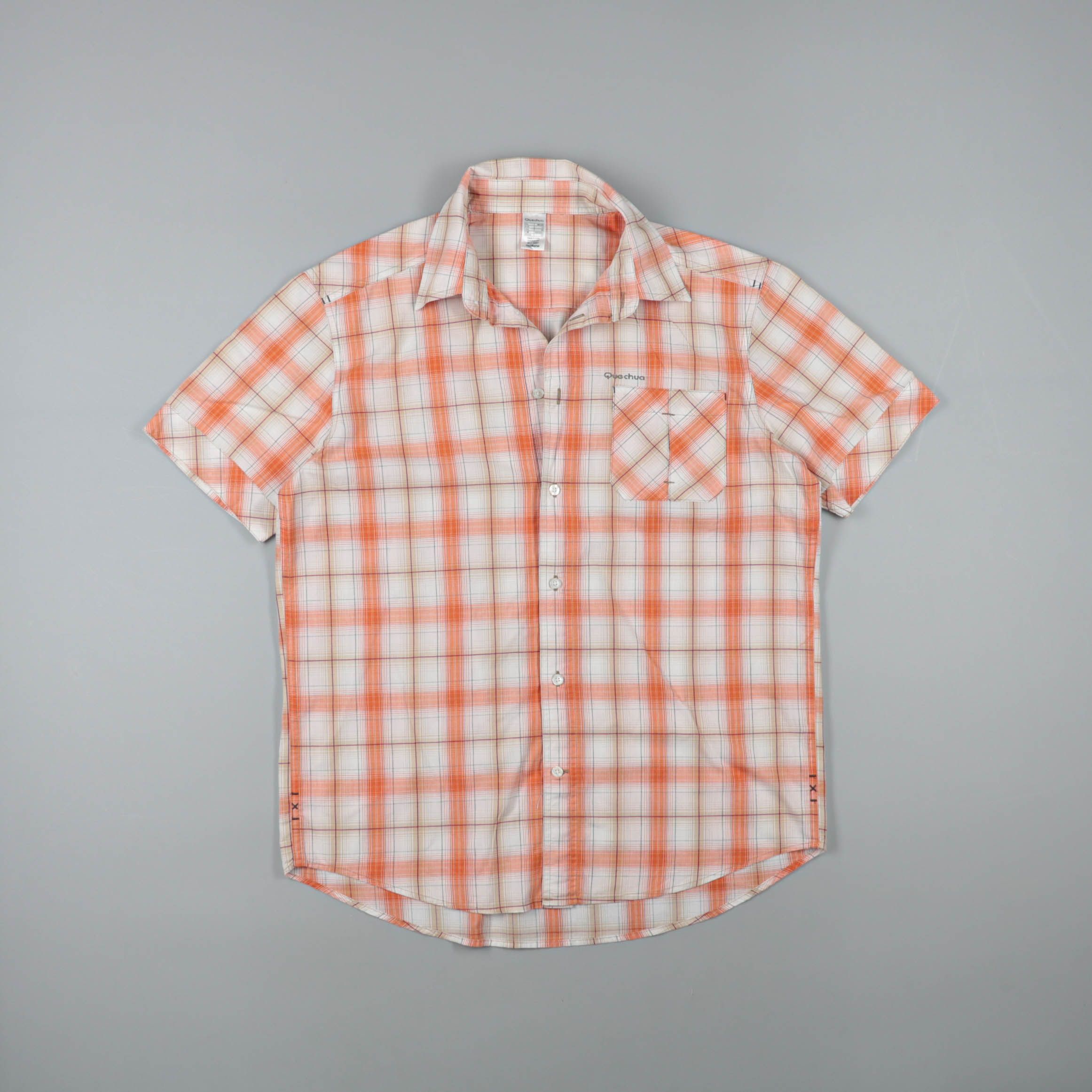 Мужская рубашка Quechua в бело-оранжевую клетку, с коротким рукавом и нагрудным карманом. Подойдёт для лета, поездок и повседневной носки в casual-стиле. Лёгкая ткань хорошо проветривается и комфортно носится в тёплую погоду.