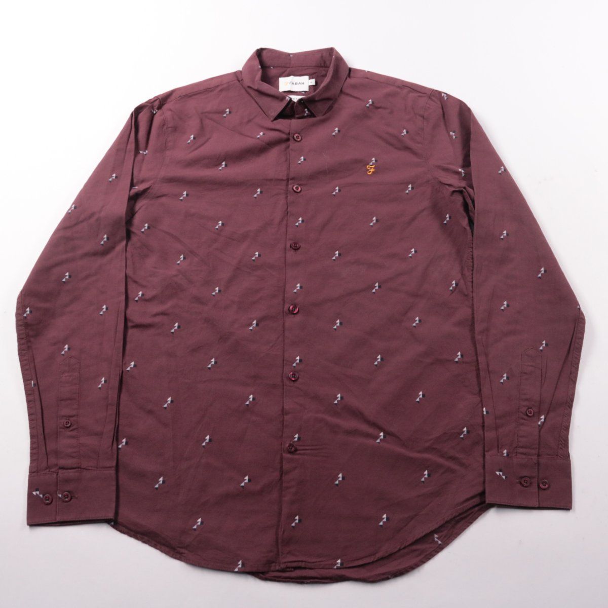 Мужская рубашка Farah Slim Fit бордового цвета с мелким принтом и вышитым логотипом на груди. Подойдёт для повседневных образов и офиса в сочетании с джинсами или брюками. Натуральный хлопок хорошо дышит и комфортен в носке.