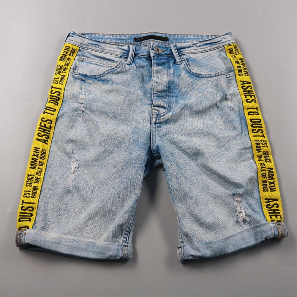 Джинсовые шорты Ashes to Dust голубого цвета с контрастными жёлтыми лампасами и лёгкими потертостями. Подойдут для летних повседневных образов и отдыха. Плотный деним с небольшим добавлением эластана комфортно сидит и не сковывает движения.
