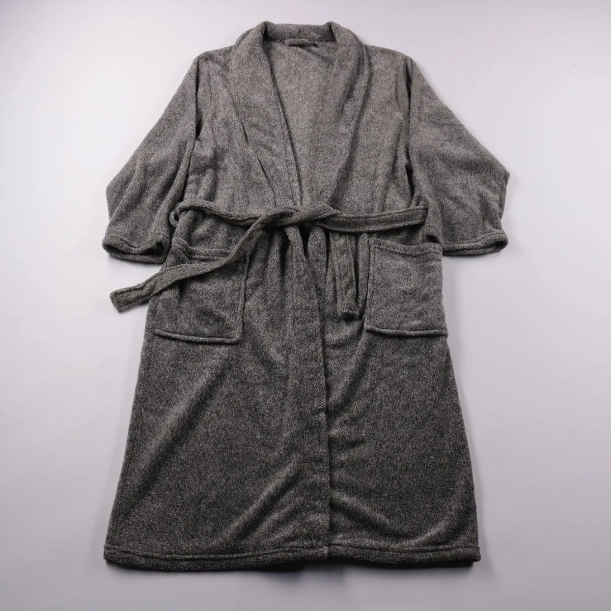 Домашний халат Cavelli из мягкого серого полиэстера, на запах с поясом и накладными карманами. Подойдёт для дома, бани или после душа, хорошо согревает и быстро сохнет.