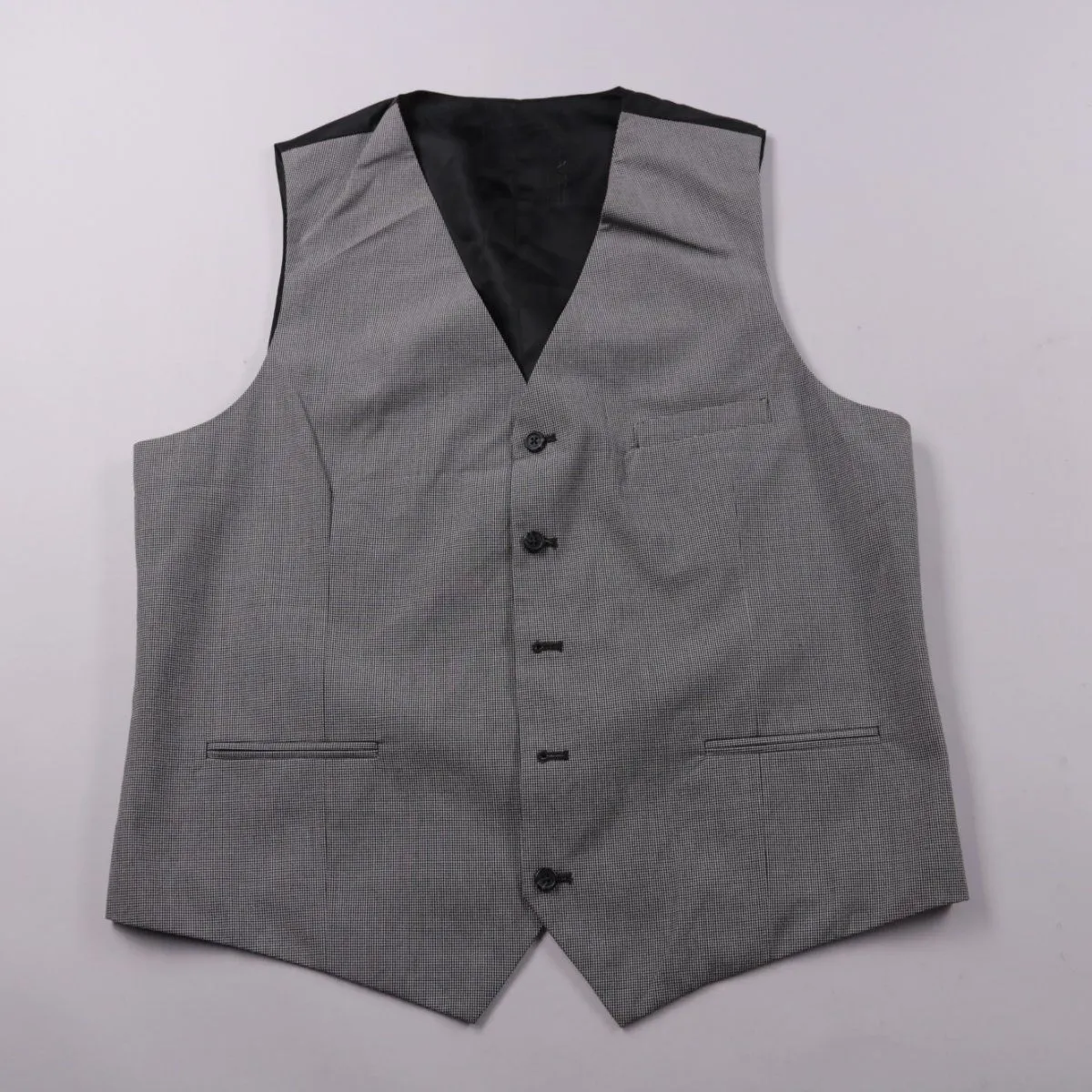Мужской классический жилет в серую мелкую клетку, с чёрной подкладкой и застёжкой на пуговицы. Подойдёт для офиса, торжеств или в комплект к костюму. Сзади есть регулируемый хлястик, чтобы подогнать посадку по талии.