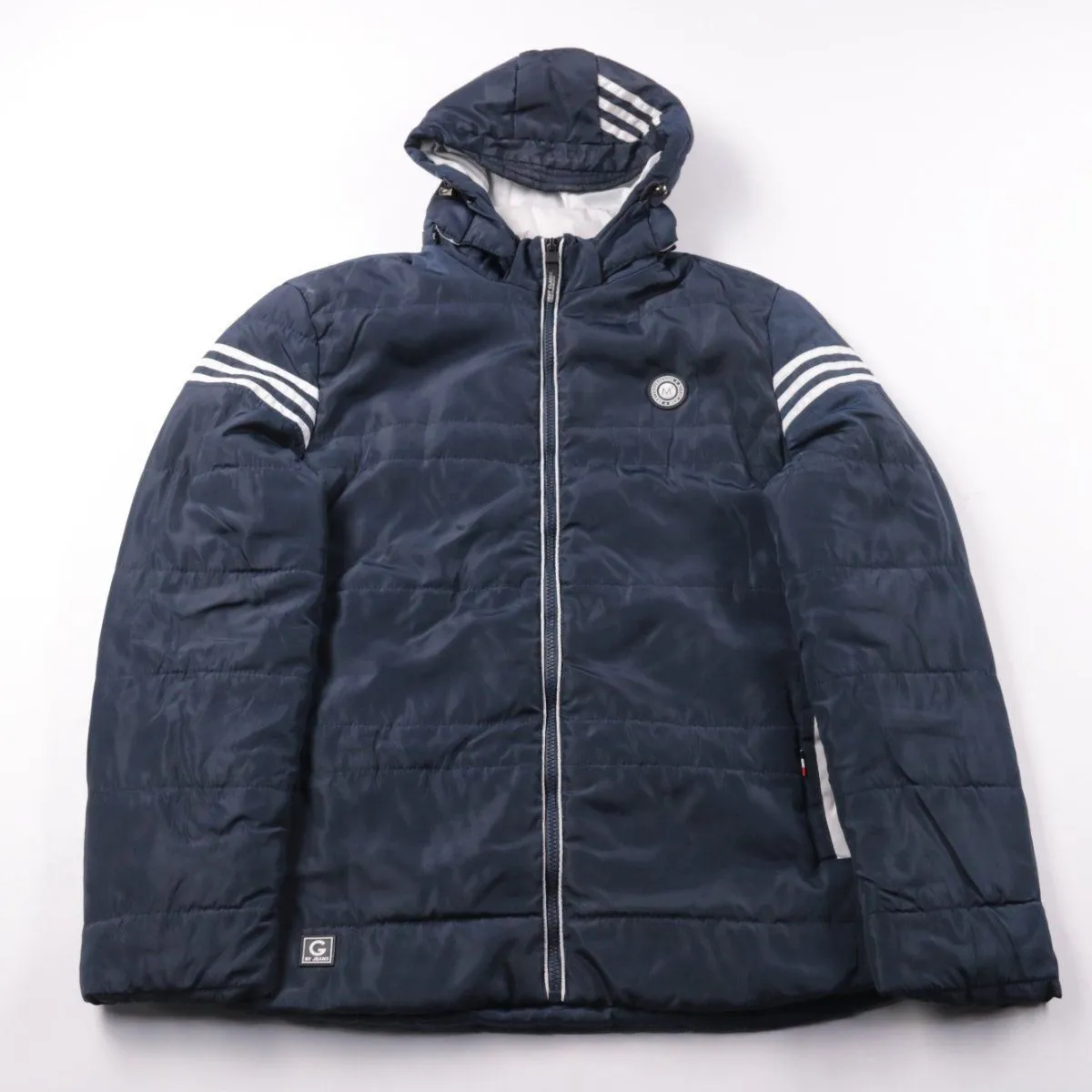 Мужская зимняя стёганая куртка с капюшоном, застёжкой на молнию и контрастными полосками на рукавах. Подойдёт для повседневной носки в холодную погоду и прогулок. Практичный плюс — тёплый синтетический утеплитель и капюшон, который защищает от ветра.