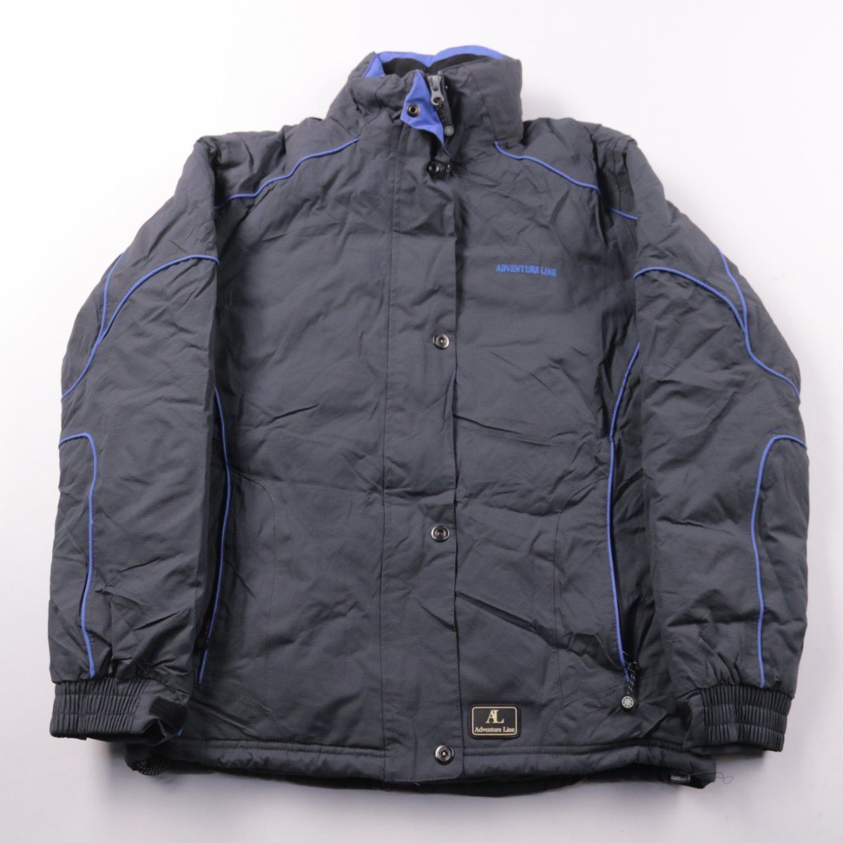 Мужская зимняя куртка Adventure Line в тёмно-сером цвете с синими вставками и высоким воротником. Подойдёт для повседневной носки и прогулок в холодную погоду, застёгивается на молнию и планку с кнопками. Практичный плюс — плотная синтетическая ткань и утепление, которые хорошо защищают от ветра.