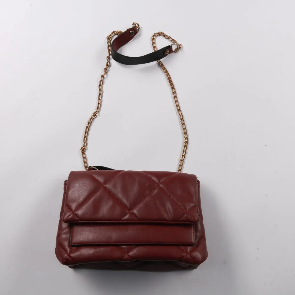 Женская сумка через плечо бордового цвета с простёжкой и клапаном на магнитных кнопках. Подойдёт для повседневных выходов, когда нужно взять с собой телефон, ключи и мелочи. Длинная цепочка позволяет носить на плече, а компактный формат не утяжеляет образ.